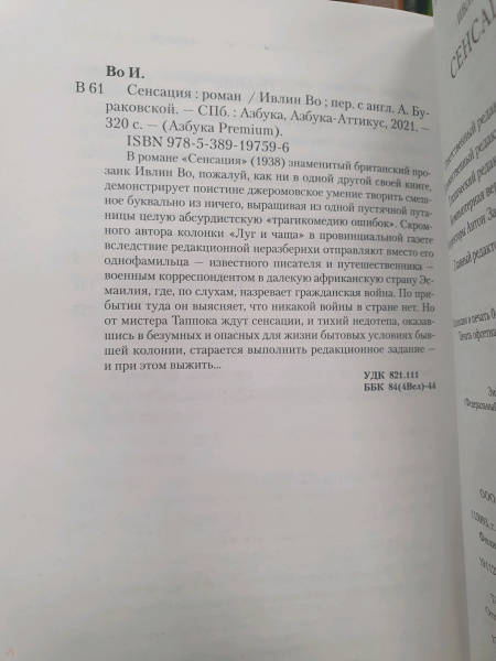ОписаниеВ романе "Сенсация" (1938) знаменитый британский прозаик Ивлин Во, пожалуй, как ни в одной другой своей книге, демонстрирует поистине джеромовское умение творить смешное буквально из ничего, выращивая из одной пустяшной путаницы целую абсурдистскую "трагикомедию ошибок". Скромного автора колонки "Луг и чаща" в провинциальной газете вследствие редакционной неразберихи отправляют вместо его однофамильца - известного писателя и путешественника - военным корреспондентом в далекую африканскую страну Эсмаилия, где, по слухам, назревает гражданская война. По прибытии туда он выясняет, что никакой войны в стране нет. Но от мистера Таппока ждут сенсации, и тихий недотепа, оказавшись в безумных и опасных для жизни бытовых условиях бывшей колонии, старается выполнить редакционное задание - и при этом выжить…В романе "Сенсация" (1938) знаменитый британский прозаик Ивлин Во, пожалуй, как ни в одной другой своей книге, демонстрирует поистине джеромовское умение творить смешное буквально из ничего, выращивая из одной пустяшной путаницы целую абсурдистскую "трагикомедию ошибок". Скромного автора колонки "Луг и чаща" в провинциальной газете вследствие редакционной неразберихи отправляют вместо его однофамильца - известного писателя и путешественника - военным корреспондентом в далекую африканскую страну Эсмаилия, где, по слухам, назревает гражданская война. По прибытии туда он выясняет, что никакой войны в стране нет. Но от мистера Таппока ждут сенсации, и тихий недотепа, оказавшись в безумных и опасных для жизни бытовых условиях бывшей колонии, старается выполнить редакционное задание - и при этом выжить…