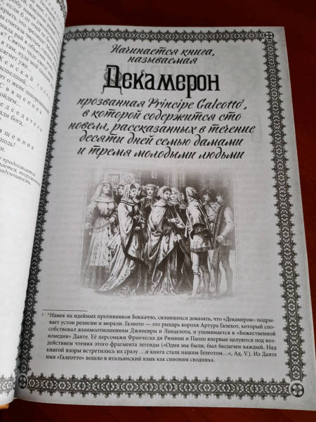 ОписаниеВ XIV веке, когда Италия была объята эпидемией чумы, сотни трупов застилали мостовые города, люди готовились к концу света. Три благородных юноши и семь юных девушек сбежали из самого жерла эпидемии за город. Закрывшись от мира на старинной вилле, они стали коротать вечера, рассказывая друг другу истории. Одни из историй поражали своей откровенностью, другие - пугали, а третьи заставляли молодых людей неожиданно вспомнить о том, что на самом деле значат такие слова, как: любовь, человечность и благородство. Каждый день они обсуждали ужасные подробности чумной эпидемии, почти уничтожившей их родной город, и каждый день, желая ощутить радость жизни на пороге смерти, они рассказывали все более захватывающие и ужасающие истории. Десять дней они рассказывали по десять историй."Декамерон" Боккаччо стал одним из главных произведений итальянского Ренессанса. Великая книга была написана в 1350-х годах, после вспышки чумы, унесшей половину населения Италии. Церковь запретила "Декамерон" из-за большого количества аморальных, эротических и жестоких сцен, но жители страны моментально полюбили книгу, воспевающую силу любви и радость к жизни, книгу, описывающую все, даже самые ужасные стороны человеческой жизни и напоминающую о силе человеческого духа. Как никогда "Декамерон" актуален и сегодня. Предлагаемое издание содержит в себе самый полный перевод книги, изданный без каких-либо купюр и сокращений.СвернутьВ XIV веке, когда Италия была объята эпидемией чумы, сотни трупов застилали мостовые города, люди готовились к концу света. Три благородных юноши и семь юных девушек сбежали из самого жерла эпидемии за город. Закрывшись от мира на старинной вилле, они стали коротать вечера, рассказывая друг другу истории. Одни из историй поражали своей откровенностью, другие - пугали, а третьи заставляли молодых людей неожиданно вспомнить о том, что на самом деле значат такие слова, как: любовь, человечность и благородство. Каждый день они обсуждали ужасные подробности чумной эпидемии, почти уничтожившей их родной город, и каждый день, желая ощутить радость жизни на пороге смерти, они рассказывали все более захватывающие и ужасающие истории. Десять дней они рассказывали по десять историй."Декамерон" Боккаччо стал одним из главных произведений итальянского Ренессанса. Великая книга была написана в 1350-х годах, после вспышки чумы, унесшей половину населения Италии. Церковь запретила "Декамерон" из-за большого количества аморальных, эротических и жестоких сцен, но жители страны моментально полюбили книгу, воспевающую силу любви и радость к жизни, книгу, описывающую все, даже самые ужасные стороны человеческой жизни и напоминающую о силе человеческого духа. Как никогда "Декамерон" актуален и сегодня. Предлагаемое издание содержит в себе самый полный перевод книги, изданный без каких-либо купюр и сокращений.СвернутьСвернуть