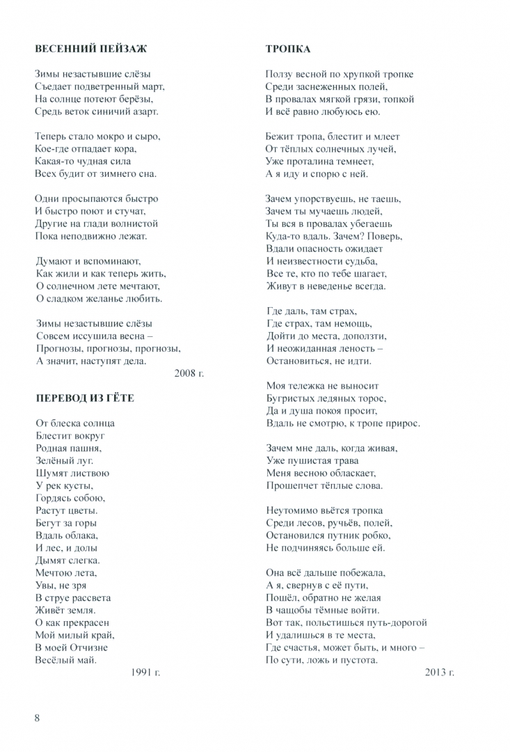 ОписаниеИмя поэта известно узкому кругу читателей. С одной стороны, его слабая активность объясняется скромностью поэта, нежеланием выставлять напоказ свои чувства общественному мнению. С другой стороны, его занятостью в области популяризации философских проблем и преподаванием философии в его родном МИИТе (Московский институт инженеров транспорта). Будучи его профессором, он удивительно совмещает науку и поэзию. Поэтическое творчество поэта буквально пропитано духом философских размышлений. Сборник стихов "Поэзия годов моих" в прямом смысле отражает многолетнюю жизнь автора.Имя поэта известно узкому кругу читателей. С одной стороны, его слабая активность объясняется скромностью поэта, нежеланием выставлять напоказ свои чувства общественному мнению. С другой стороны, его занятостью в области популяризации философских проблем и преподаванием философии в его родном МИИТе (Московский институт инженеров транспорта). Будучи его профессором, он удивительно совмещает науку и поэзию. Поэтическое творчество поэта буквально пропитано духом философских размышлений. Сборник стихов "Поэзия годов моих" в прямом смысле отражает многолетнюю жизнь автора.