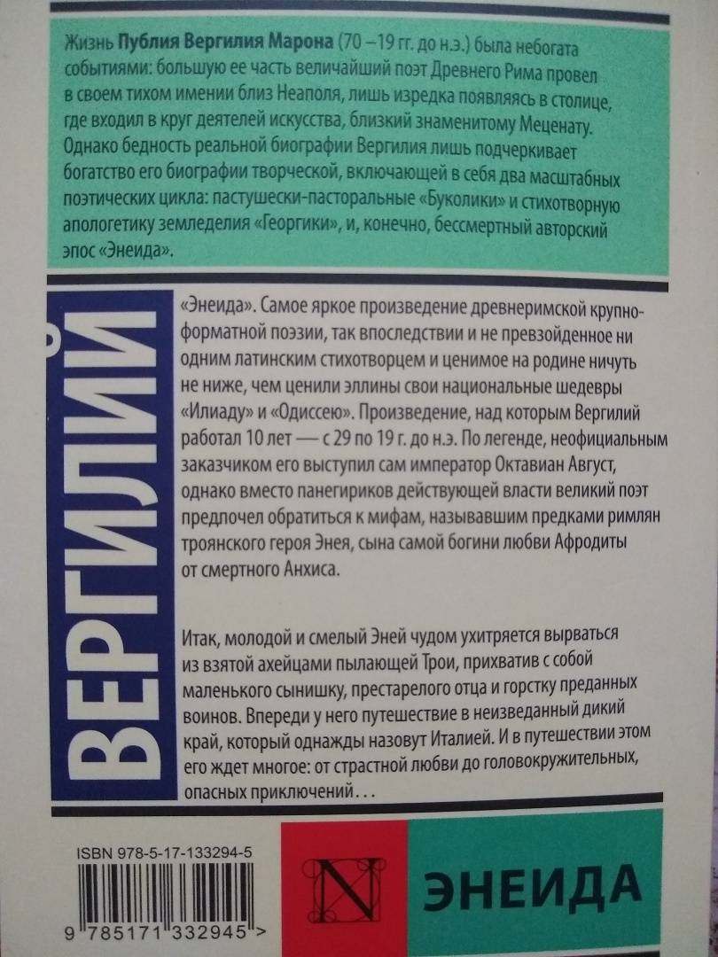 Описание"Энеида". Самое яркое произведение древнеримской крупноформатной поэзии, так впоследствии и не превзойденное ни одним латинским стихотворцем и ценимое на родине ничуть не ниже, чем ценили эллины свои национальные шедевры "Илиаду" и "Одиссею". Произведение, над которым Вергилий работал 10 лет - с 29 по 19 г. до н.э. По легенде, неофициальным заказчиком его выступил сам император Октавиан Август, однако вместо панегириков действующей власти великий поэт предпочел обратиться к мифам, называвшим предками римлян троянского героя Энея, сына самой богини любви Афродиты от смертного Анхиса.Итак, молодой и смелый Эней чудом ухитряется вырваться из взятой ахейцами пылающей Трои, прихватив с собой маленького сынишку, престарелого отца и горстку преданных воинов. Впереди у него путешествие в неизведанный дикий край, который однажды назовут Италией. И в путешествии этом его ждет многое: от страстной любви до головокружительных, опасных приключений…"Энеида". Самое яркое произведение древнеримской крупноформатной поэзии, так впоследствии и не превзойденное ни одним латинским стихотворцем и ценимое на родине ничуть не ниже, чем ценили эллины свои национальные шедевры "Илиаду" и "Одиссею". Произведение, над которым Вергилий работал 10 лет - с 29 по 19 г. до н.э. По легенде, неофициальным заказчиком его выступил сам император Октавиан Август, однако вместо панегириков действующей власти великий поэт предпочел обратиться к мифам, называвшим предками римлян троянского героя Энея, сына самой богини любви Афродиты от смертного Анхиса.Итак, молодой и смелый Эней чудом ухитряется вырваться из взятой ахейцами пылающей Трои, прихватив с собой маленького сынишку, престарелого отца и горстку преданных воинов. Впереди у него путешествие в неизведанный дикий край, который однажды назовут Италией. И в путешествии этом его ждет многое: от страстной любви до головокружительных, опасных приключений…
