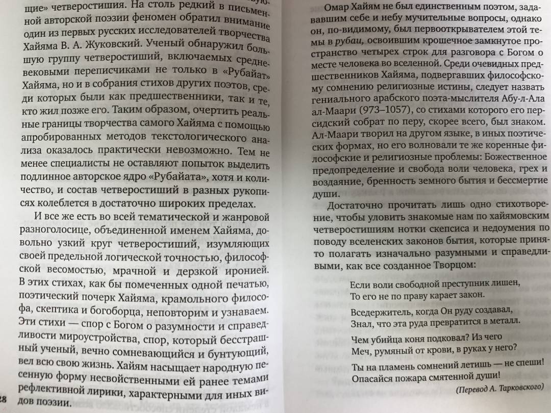 ОписаниеВеликий поэт и выдающийся ученый Омар Хайям родился в городе Нишапуре в 1048 году. Его перу принадлежит ряд трудов по философии, астрономии и математике, причем в области математики он на несколько веков опередил своих современников. Сегодня научные труды Хайяма известны в основном лишь специалистам по истории науки. Всемирную же славу Омару Хайяму принесли его четверостишия-рубаи, лирический герой которых пытается понять мироздание, постигнуть природу человека и Бога.Великий поэт и выдающийся ученый Омар Хайям родился в городе Нишапуре в 1048 году. Его перу принадлежит ряд трудов по философии, астрономии и математике, причем в области математики он на несколько веков опередил своих современников. Сегодня научные труды Хайяма известны в основном лишь специалистам по истории науки. Всемирную же славу Омару Хайяму принесли его четверостишия-рубаи, лирический герой которых пытается понять мироздание, постигнуть природу человека и Бога.