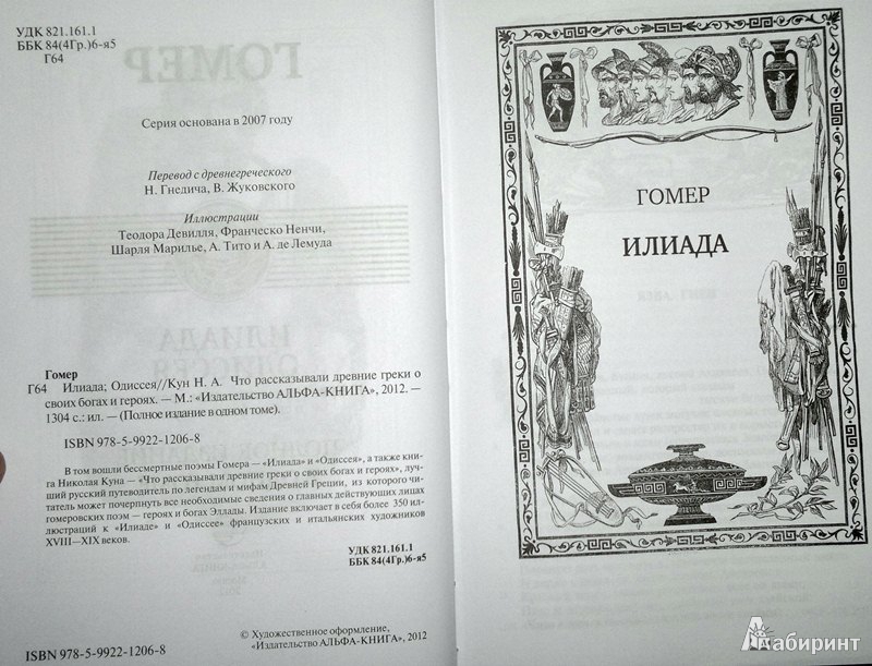 ОписаниеВ том вошли бессмертные поэмы Гомера - "Илиада" и "Одиссея", а также книга Николая Куна - "Что рассказывали древние греки о своих богах и героях", лучший русский путеводитель по легендам и мифам Древней Греции, из которого читатель может почерпнуть все необходимые сведения о главных действующих лицах гомеровских поэм - героях и богах Эллады. Издание включает в себя более 350 иллюстраций к "Илиаде" и "Одиссее" французских и итальянских художников XVIII-XIX веков.В том вошли бессмертные поэмы Гомера - "Илиада" и "Одиссея", а также книга Николая Куна - "Что рассказывали древние греки о своих богах и героях", лучший русский путеводитель по легендам и мифам Древней Греции, из которого читатель может почерпнуть все необходимые сведения о главных действующих лицах гомеровских поэм - героях и богах Эллады. Издание включает в себя более 350 иллюстраций к "Илиаде" и "Одиссее" французских и итальянских художников XVIII-XIX веков.