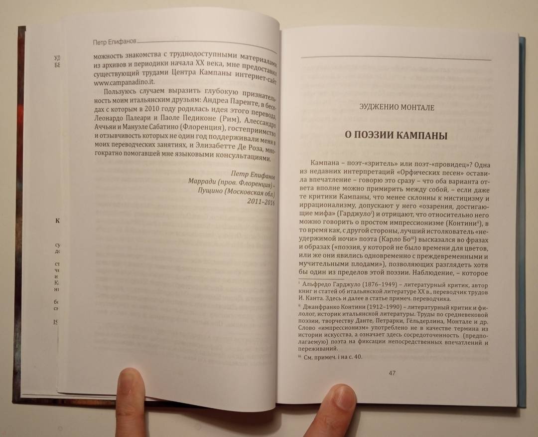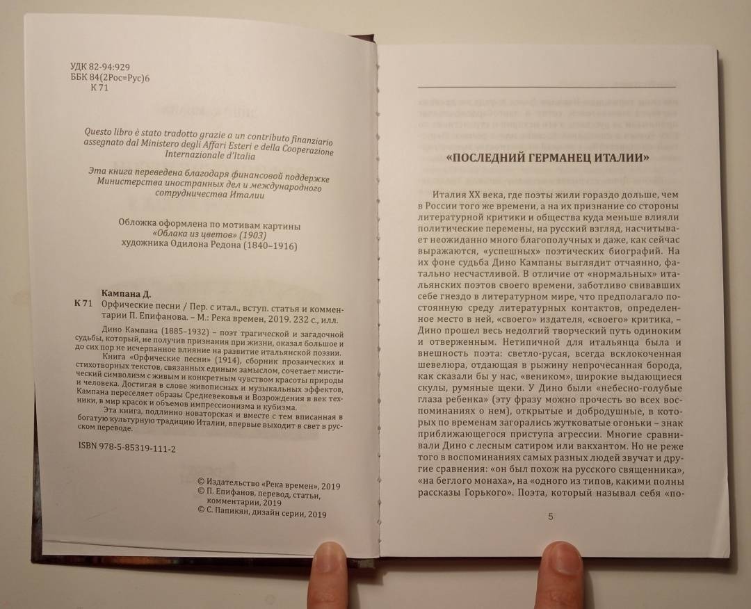ОписаниеДино Кампана [1885-1932] - поэт трагической и загадочной судьбы, который, не получив признания при жизни, оказал большое и до сих пор не исчерпанное влияние на развитие итальянской поэзии.Книга "Орфические песни" (1914], сборник прозаических и стихотворных текстов, связанных единым замыслом, сочетает мистический символизм с живым и конкретным чувством красоты природы и человека. Достигая в слове живописных и музыкальных эффектов, Кампана переселяет образы Средневековья и Возрождения в век техники, в мир красок и объемов импрессионизма и кубизма.Эта книга, подлинно новаторская и вместе с тем вписанная в богатую культурную традицию Италии, впервые выходит в свет в русском переводе.Дино Кампана [1885-1932] - поэт трагической и загадочной судьбы, который, не получив признания при жизни, оказал большое и до сих пор не исчерпанное влияние на развитие итальянской поэзии.Книга "Орфические песни" (1914], сборник прозаических и стихотворных текстов, связанных единым замыслом, сочетает мистический символизм с живым и конкретным чувством красоты природы и человека. Достигая в слове живописных и музыкальных эффектов, Кампана переселяет образы Средневековья и Возрождения в век техники, в мир красок и объемов импрессионизма и кубизма.Эта книга, подлинно новаторская и вместе с тем вписанная в богатую культурную традицию Италии, впервые выходит в свет в русском переводе.