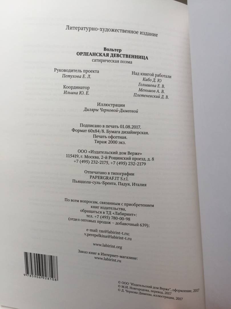 Описание"Орлеанская девственница" была издана анонимно и стала одним из самых популярных неподцензурных произведений Вольтера, она получила известность за пределами Франции как образец скептически-иронического "вольнодумства" XVIII века, однако убежденный и страстный противник абсолютизма Вольтер остался до конца жизни монархистом, сторонником идеи просвещенного абсолютизма, монархии, опирающейся на "образованную часть" общества, на интеллигенцию, на "философов". В своей сатирической поэме "Орлеанская девственница" он высмеивает рыцарей и придворных, рассказывая о событиях жизни национальной героини (тогда еще не канонизированной святой) Жанны д'Арк, которые представлены в комическом ключе, столь же иронически показаны французские рыцари и церковь. "Орлеанская девственница" в молодости была одной из любимых книг Пушкина, он подражал ей в "Руслане и Людмиле", начал ее перевод, а впоследствии посвятил "преступной поэме" свое последнее произведение, весьма критическое в адрес Вольтера. В любом случае это издание предоставит вам возможность самим оценить все достоинства и недостатки поэмы. Оно прекрасно иллюстрировано и дает полное представление о времени и обществе, которое описывает Вольтер.Великолепный перевод Н. Гумилева сделал это произведение бесценным образцом мировой классики.Свернуть"Орлеанская девственница" была издана анонимно и стала одним из самых популярных неподцензурных произведений Вольтера, она получила известность за пределами Франции как образец скептически-иронического "вольнодумства" XVIII века, однако убежденный и страстный противник абсолютизма Вольтер остался до конца жизни монархистом, сторонником идеи просвещенного абсолютизма, монархии, опирающейся на "образованную часть" общества, на интеллигенцию, на "философов". В своей сатирической поэме "Орлеанская девственница" он высмеивает рыцарей и придворных, рассказывая о событиях жизни национальной героини (тогда еще не канонизированной святой) Жанны д'Арк, которые представлены в комическом ключе, столь же иронически показаны французские рыцари и церковь. "Орлеанская девственница" в молодости была одной из любимых книг Пушкина, он подражал ей в "Руслане и Людмиле", начал ее перевод, а впоследствии посвятил "преступной поэме" свое последнее произведение, весьма критическое в адрес Вольтера. В любом случае это издание предоставит вам возможность самим оценить все достоинства и недостатки поэмы. Оно прекрасно иллюстрировано и дает полное представление о времени и обществе, которое описывает Вольтер.Великолепный перевод Н. Гумилева сделал это произведение бесценным образцом мировой классики.СвернутьСвернуть