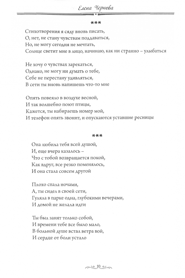 ОписаниеЗдравствуйте дорогие читатели. Я автор данного сборника стихотворений, Елена Чернова. Поэт и писатель, пишу романы и стихи на реальных событиях. Еще являюсь фотографом и преподавателем английского языка более 10 лет.Стихотворения пишу не просто так и не без причин. С помощью своих произведений, хочется передать вам всю силу чувств и буйство красок природы, иными словами мир моими глазами. Не буду с вами спорить о совершенствах и идеале мира, он не совершенен, но по-своему прекрасен и богат. А наши чувства могут сильнее нас оказаться и подталкивать на совершение разных поступков. Главное всегда оставаться собой и идти только вперед, не оборачиваясь на прошлое, назад. Книги, безусловно, на любителя.Скажу честно, да в школе я не любила читать. Просто учителя преподносили это как должное и не пытались заинтересовать. И книги я полюбила лишь со временем и очень ими увлеклась. Мои же книги нацелены на то, чтобы показать вам все самое прекрасное, чтобы научить вас разным ситуациям, показать силу эмоций. Эмоции это самое сильное, что есть в нас, в моем же случае они сильнее меня самой. И все же к чему я веду эту дискуссию? Да к тому, что читать очень полезно, и просто хочу, чтобы вы научились замечать то хорошее, что еще осталось.СвернутьЗдравствуйте дорогие читатели. Я автор данного сборника стихотворений, Елена Чернова. Поэт и писатель, пишу романы и стихи на реальных событиях. Еще являюсь фотографом и преподавателем английского языка более 10 лет.Стихотворения пишу не просто так и не без причин. С помощью своих произведений, хочется передать вам всю силу чувств и буйство красок природы, иными словами мир моими глазами. Не буду с вами спорить о совершенствах и идеале мира, он не совершенен, но по-своему прекрасен и богат. А наши чувства могут сильнее нас оказаться и подталкивать на совершение разных поступков. Главное всегда оставаться собой и идти только вперед, не оборачиваясь на прошлое, назад. Книги, безусловно, на любителя.Скажу честно, да в школе я не любила читать. Просто учителя преподносили это как должное и не пытались заинтересовать. И книги я полюбила лишь со временем и очень ими увлеклась. Мои же книги нацелены на то, чтобы показать вам все самое прекрасное, чтобы научить вас разным ситуациям, показать силу эмоций. Эмоции это самое сильное, что есть в нас, в моем же случае они сильнее меня самой. И все же к чему я веду эту дискуссию? Да к тому, что читать очень полезно, и просто хочу, чтобы вы научились замечать то хорошее, что еще осталось.СвернутьСвернуть