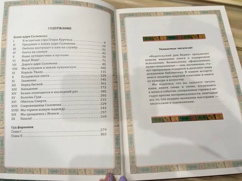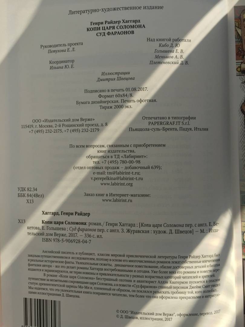ОписаниеАнглийский писатель и публицист, классик мировой приключенческой литературы Генри Райдер Хаггард был заядлым путешественником и исследователем, поэтому в основе его многочисленных романов лежат собственные впечатления и реальные исторические факты. Увлекательные сюжеты, динамичное повествование, обилие достоверных деталей и богатая фантазия автора - все это делает романы Хаггарда востребованными и сегодня. Уже более века его романы и повести переиздаются и экранизируются, не теряя новизны и привлекательности у разных возрастных категорий читателей и зрителей.В романе "Копи царя Соломона" бесстрашный охотник и авантюрист Аллэн Кватермэн пускается в опасное путешествие за несметными сокровищами царя Соломона, а в повести "Суд фараонов" главный персонаж Джеймс Смит увидел статую древнеегипетской царицы Ma-Ми и, плененный ее образом, он поклялся разыскать гробницу той, кого полюбил.Мы надеемся, что эта увлекательная книга понравится читателю, тем более что она оформлена прекрасными и интригующими иллюстрациями Д. Швецова.СвернутьАнглийский писатель и публицист, классик мировой приключенческой литературы Генри Райдер Хаггард был заядлым путешественником и исследователем, поэтому в основе его многочисленных романов лежат собственные впечатления и реальные исторические факты. Увлекательные сюжеты, динамичное повествование, обилие достоверных деталей и богатая фантазия автора - все это делает романы Хаггарда востребованными и сегодня. Уже более века его романы и повести переиздаются и экранизируются, не теряя новизны и привлекательности у разных возрастных категорий читателей и зрителей.В романе "Копи царя Соломона" бесстрашный охотник и авантюрист Аллэн Кватермэн пускается в опасное путешествие за несметными сокровищами царя Соломона, а в повести "Суд фараонов" главный персонаж Джеймс Смит увидел статую древнеегипетской царицы Ma-Ми и, плененный ее образом, он поклялся разыскать гробницу той, кого полюбил.Мы надеемся, что эта увлекательная книга понравится читателю, тем более что она оформлена прекрасными и интригующими иллюстрациями Д. Швецова.СвернутьСвернуть
