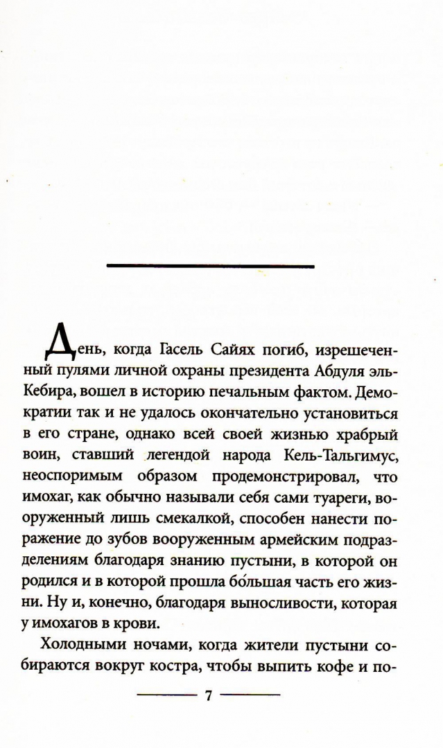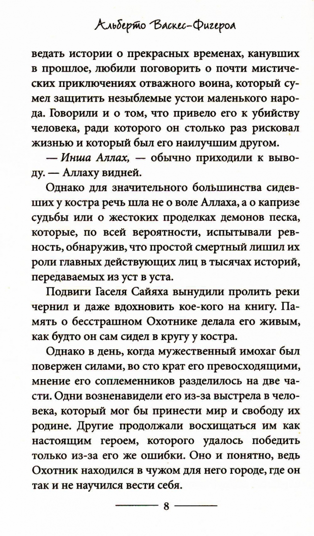 ОписаниеВпервые на русском языке! Долгожданное продолжение культового романа "Туарег"! День, когда Гасель Сайях погиб, вошел в историю и стал началом новой легенды. Легенды о силе духа и борьбе за выживание. Семья Охотника подвержена гонениям и нигде они не могут обрести покой. Казалось, после многих лет скитаний, забрезжила надежда, но пустыня слишком безжалостна и голодна до человеческих жизней. С приходом французов под угрозой оказывается единственный источник жизни для туарегов – вода. Ралли-рейд – развлечение для чужеземцев и трагедия для кочевого племени. Бессмысленная гонка, загрязняющая окружающую среду и уничтожающая все вокруг. Чтобы остановить ее, туареги готовы на все… "Блестящий роман от одного из самых лучших испанских писателей нашего времени!" - Хосе Мануэль Лара, президент Grupo Planeta, крупнейшей издательской группы Испании и Латинской АмерикиВпервые на русском языке! Долгожданное продолжение культового романа "Туарег"! День, когда Гасель Сайях погиб, вошел в историю и стал началом новой легенды. Легенды о силе духа и борьбе за выживание. Семья Охотника подвержена гонениям и нигде они не могут обрести покой. Казалось, после многих лет скитаний, забрезжила надежда, но пустыня слишком безжалостна и голодна до человеческих жизней. С приходом французов под угрозой оказывается единственный источник жизни для туарегов – вода. Ралли-рейд – развлечение для чужеземцев и трагедия для кочевого племени. Бессмысленная гонка, загрязняющая окружающую среду и уничтожающая все вокруг. Чтобы остановить ее, туареги готовы на все… "Блестящий роман от одного из самых лучших испанских писателей нашего времени!" - Хосе Мануэль Лара, президент Grupo Planeta, крупнейшей издательской группы Испании и Латинской Америки