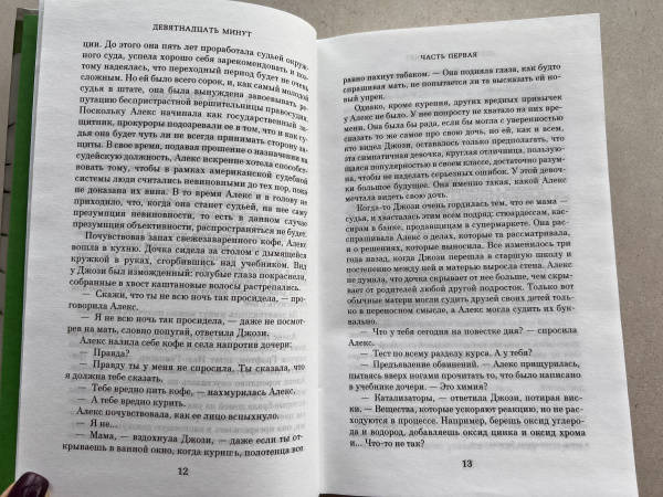 Роман «Девятнадцать минут» ставит простые вопросы, на которые нет простых ответов. Можно ли не знать собственного ребенка? Что значит быть не таким, как все? Оправдано ли желание жертвы нанести ответный удар? И кому вершить суд, если кто-нибудь из нас вообще вправе судить другого?СвернутьЗа девятнадцать минут можно постричь газон перед домом, или покрасить волосы, или испечь лепешки к завтраку.
