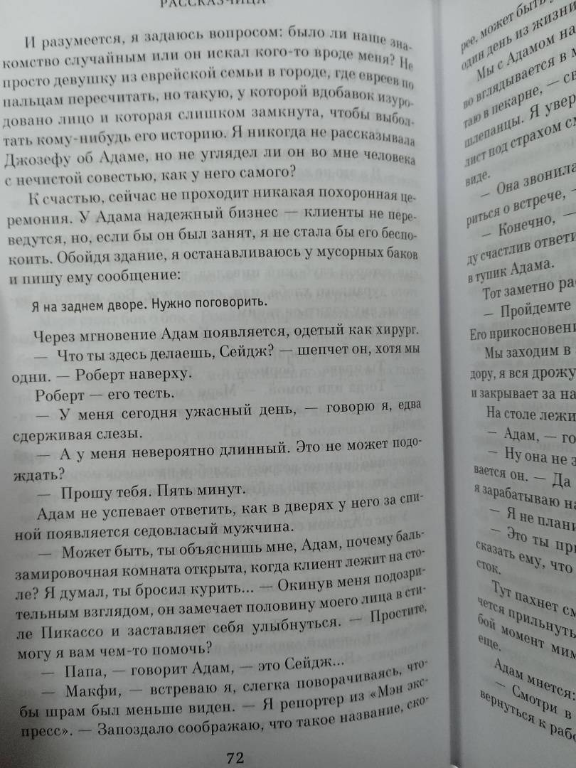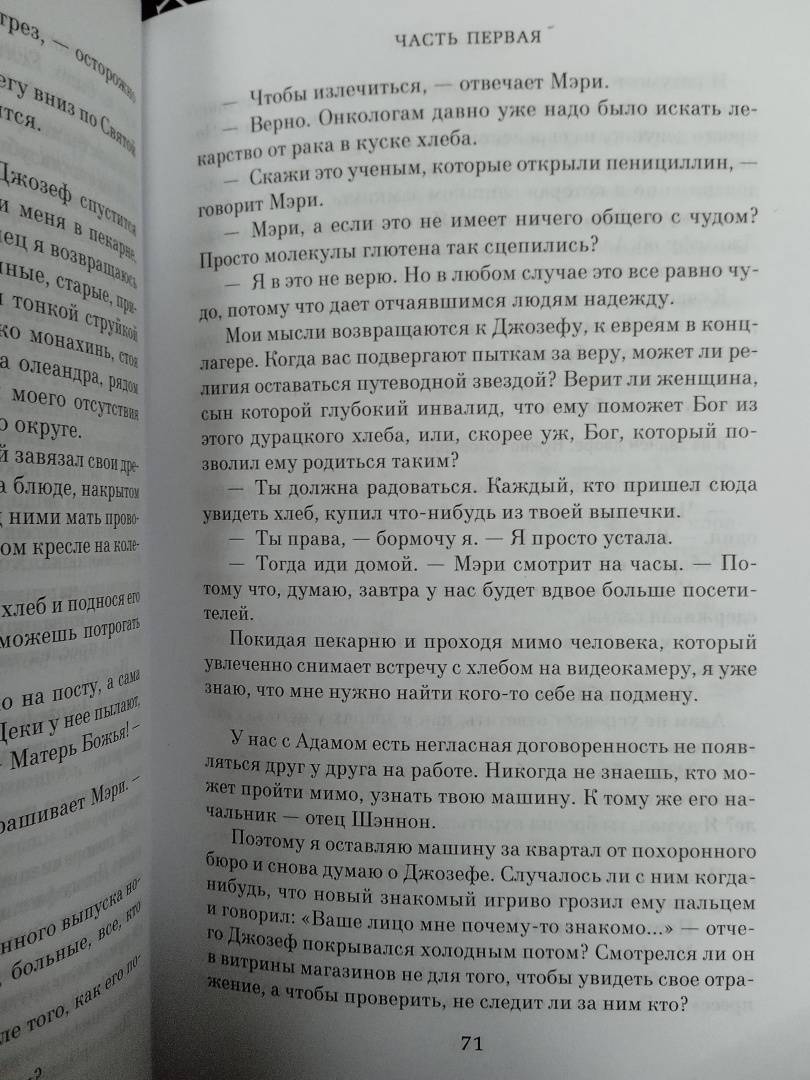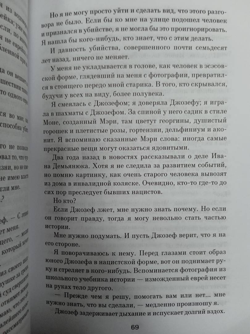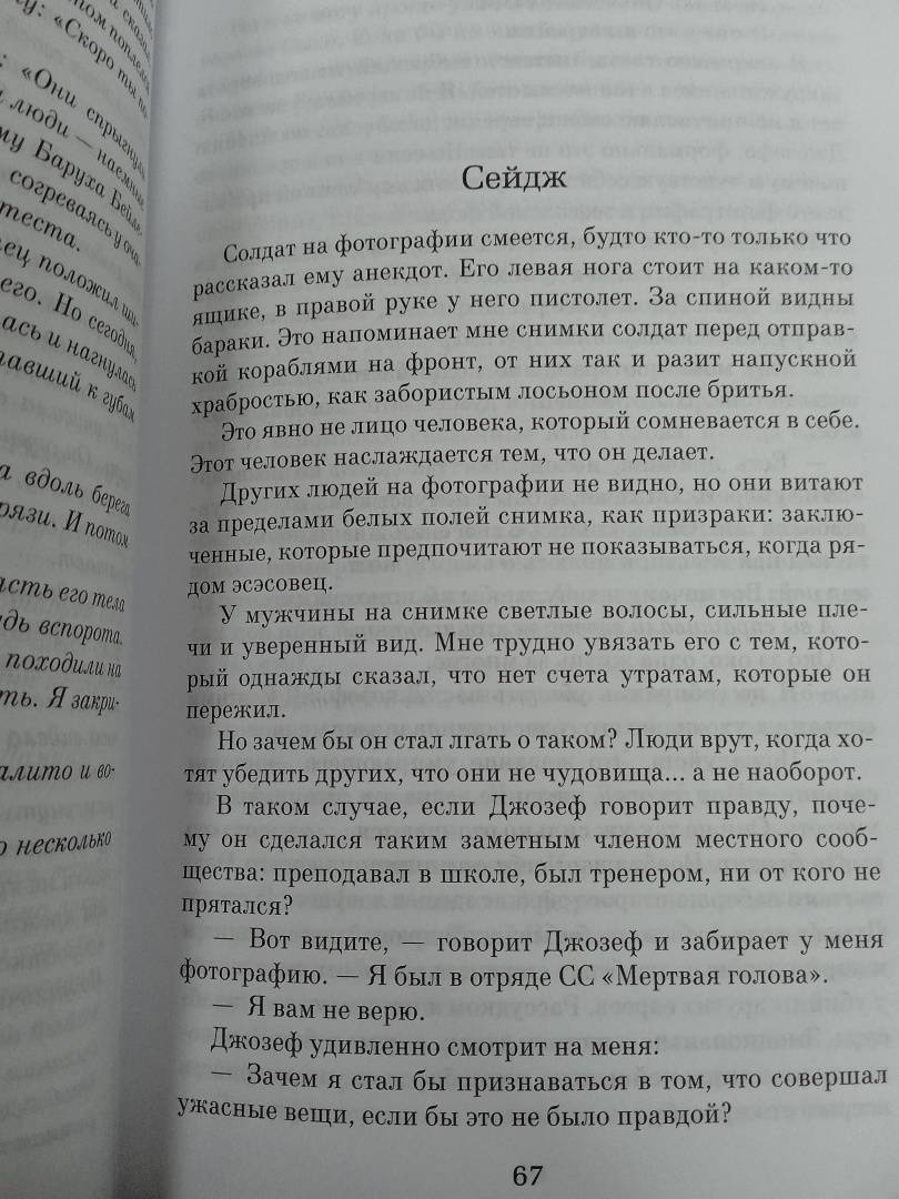 ОписаниеПосле трагического происшествия, оставившего у нее глубокий шрам не только в душе, но и на лице, Сейдж стала сторониться людей. Ночью она выпекает хлеб, а днем спит. Однажды она знакомится с Джозефом Вебером, пожилым школьным учителем, и сближается с ним, несмотря на разницу в возрасте. Сейдж кажется, что жизнь наконец-то дала ей шанс на исцеление. Однако все меняется в тот день, когда Джозеф доверительно сообщает о своем прошлом. Оказывается, этот добрый, внимательный и застенчивый человек был офицером СС в Освенциме, узницей которого в свое время была бабушка Сейдж, рассказавшая внучке о пережитых в концлагере ужасах. И вот теперь Джозеф, много лет страдающий от осознания вины в совершенных им злодеяниях, хочет умереть и просит Сейдж простить его от имени всех убитых в лагере евреев и помочь ему уйти из жизни. Но дает ли прошлое право убивать? Захватывающий рассказ о границе между справедливостью и милосердием от всемирно известного автора Джоди Пиколт.После трагического происшествия, оставившего у нее глубокий шрам не только в душе, но и на лице, Сейдж стала сторониться людей. Ночью она выпекает хлеб, а днем спит. Однажды она знакомится с Джозефом Вебером, пожилым школьным учителем, и сближается с ним, несмотря на разницу в возрасте. Сейдж кажется, что жизнь наконец-то дала ей шанс на исцеление. Однако все меняется в тот день, когда Джозеф доверительно сообщает о своем прошлом. Оказывается, этот добрый, внимательный и застенчивый человек был офицером СС в Освенциме, узницей которого в свое время была бабушка Сейдж, рассказавшая внучке о пережитых в концлагере ужасах. И вот теперь Джозеф, много лет страдающий от осознания вины в совершенных им злодеяниях, хочет умереть и просит Сейдж простить его от имени всех убитых в лагере евреев и помочь ему уйти из жизни. Но дает ли прошлое право убивать? Захватывающий рассказ о границе между справедливостью и милосердием от всемирно известного автора Джоди Пиколт.