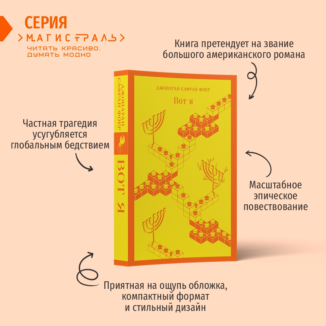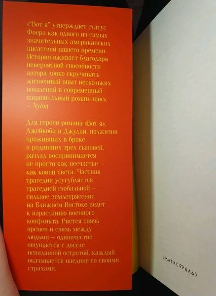 ОписаниеДжонатан Сафран Фоер - автор романов "Полная иллюминация", "Жутко громко и запредельно близко", "Вот я" и нехудожественных произведений "Мясо. Eating Animals" и "Погода - это мы".Последний художественный роман Фоера ждали более десяти лет. "Вот я" - масштабное эпическое повествование, книга, явно претендующая на звание большого американского романа. Российский читатель обязательно вспомнит всем известную цитату из "Анны Карениной": "Каждая семья несчастлива по-своему". Для героев романа "Вот я", Джейкоба и Джулии, полжизни проживших в браке и воспитавших трех сыновей, разлад воспринимается не просто как несчастье - как конец света. Частная трагедия усугубляется трагедией глобальной - сильное землетрясение на Ближнем Востоке ведет к нарастанию военного конфликта. Рвется связь времен и связь между людьми - одиночество ощущается с доселе невиданной остротой, каждый оказывается наедине со своими страхами.Отныне героям придется посмотреть на свою жизнь по-новому и увидеть зазор - между жизнью желаемой и жизнью проживаемой.СвернутьДжонатан Сафран Фоер - автор романов "Полная иллюминация", "Жутко громко и запредельно близко", "Вот я" и нехудожественных произведений "Мясо. Eating Animals" и "Погода - это мы".Последний художественный роман Фоера ждали более десяти лет. "Вот я" - масштабное эпическое повествование, книга, явно претендующая на звание большого американского романа. Российский читатель обязательно вспомнит всем известную цитату из "Анны Карениной": "Каждая семья несчастлива по-своему". Для героев романа "Вот я", Джейкоба и Джулии, полжизни проживших в браке и воспитавших трех сыновей, разлад воспринимается не просто как несчастье - как конец света. Частная трагедия усугубляется трагедией глобальной - сильное землетрясение на Ближнем Востоке ведет к нарастанию военного конфликта. Рвется связь времен и связь между людьми - одиночество ощущается с доселе невиданной остротой, каждый оказывается наедине со своими страхами.Отныне героям придется посмотреть на свою жизнь по-новому и увидеть зазор - между жизнью желаемой и жизнью проживаемой.СвернутьСвернуть