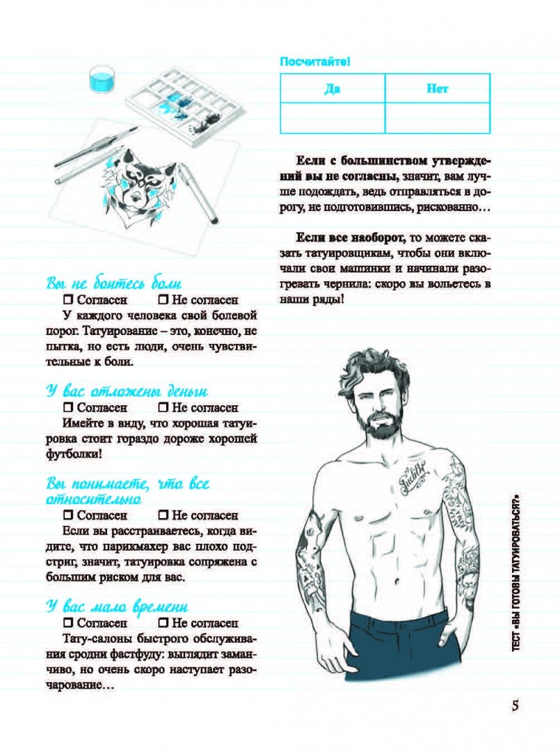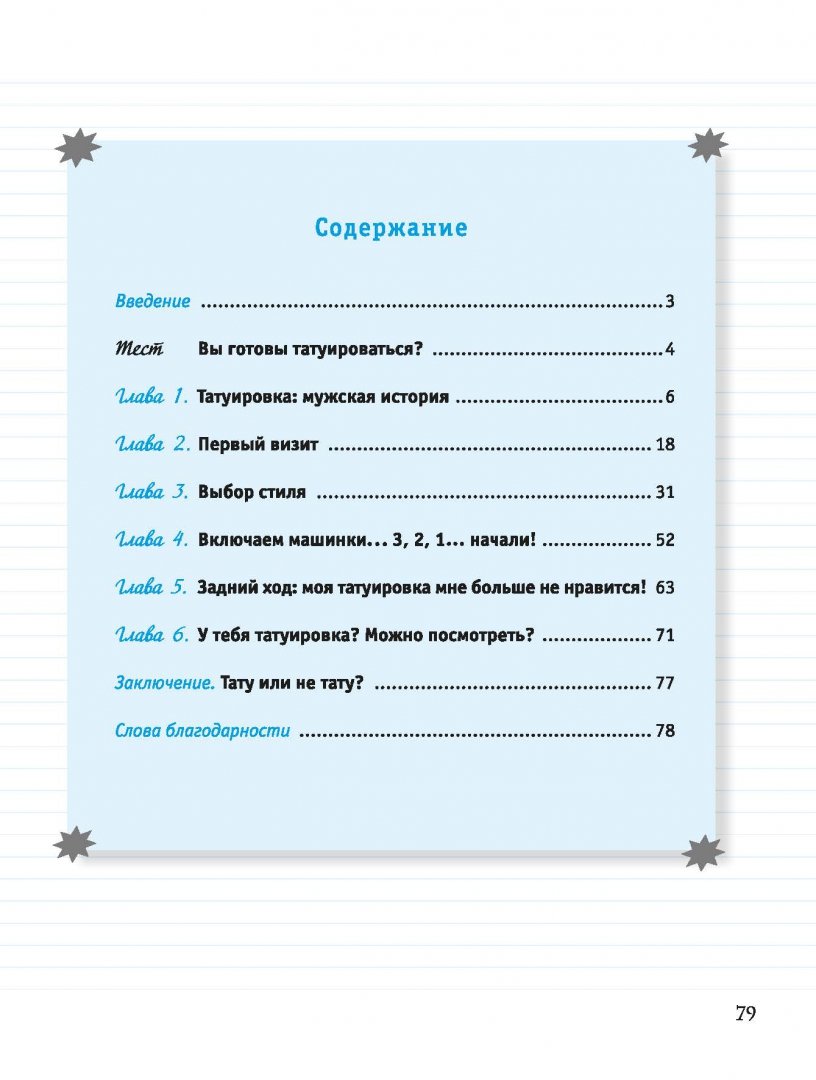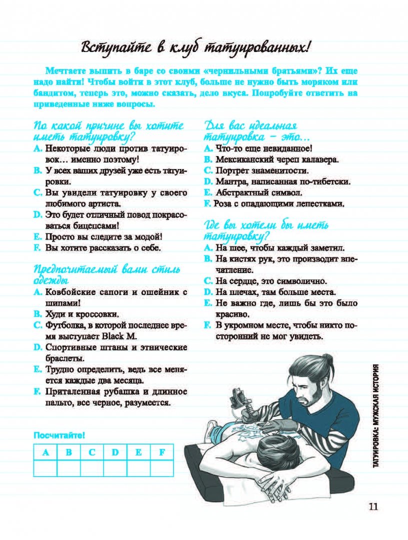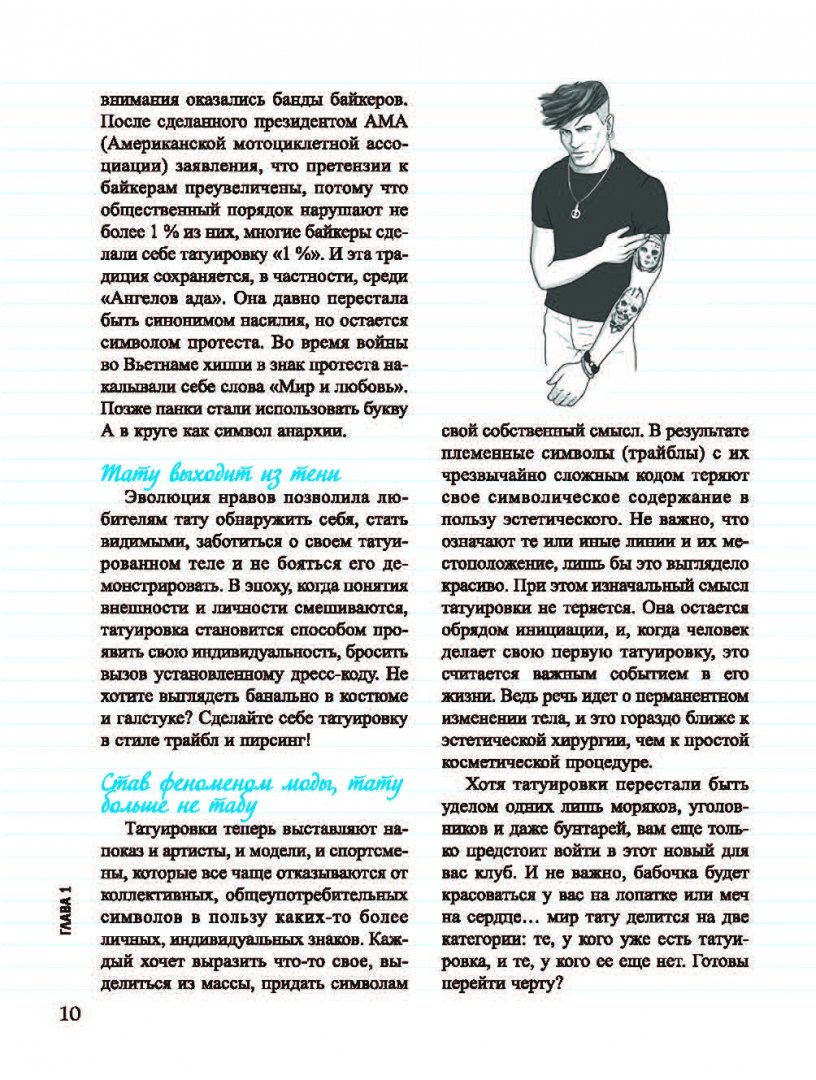 ОписаниеМир стиля делится на две категории: на тех, кто носит тату, и на всех остальных. Из этого руководства вы узнаете о татуировках, позволяющих создать свой собственный стиль и подчеркнуть индивидуальность, о выборе рисунка и мастера, а также обо всех этапах татуировочного процесса, которые приведут вас к неминуемому успеху. Тату - это круто!Мир стиля делится на две категории: на тех, кто носит тату, и на всех остальных. Из этого руководства вы узнаете о татуировках, позволяющих создать свой собственный стиль и подчеркнуть индивидуальность, о выборе рисунка и мастера, а также обо всех этапах татуировочного процесса, которые приведут вас к неминуемому успеху. Тату - это круто!