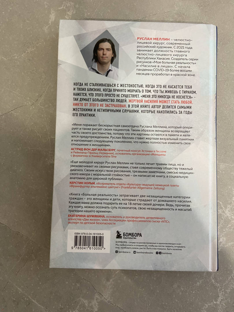 ОписаниеРуслан Меллин - челюстно-лицевой хирург и современный российский художник. В 2020 году, находясь в "красной зоне", он создал серию рисунков "Моя "больная" реальность". Однако наибольшую известность ему принесли выразительные карандашные наброски, объединенные в серию "Насилие в лицах". На этих рисунках доктор Меллин изобразил своих пациентов, ставших жертвами чужой жестокости, а в одноименной книге рассказал их реальные истории. Он показал, как за физическими травмами героев скрываются страх, беспомощность, стыд и отчаяние. За годы медицинской практики Руслан Меллин столкнулся с множеством нетипичных, шокирующих случаев и убедился, что жертвой насилия может стать каждый. Это книга о становлении молодого врача, о том, как тяжело бывает вырваться из-под власти домашнего тирана, и о людях, чья боль увидена глазами неравнодушного доктора и талантливого художника.Руслан Меллин - челюстно-лицевой хирург и современный российский художник. В 2020 году, находясь в "красной зоне", он создал серию рисунков "Моя "больная" реальность". Однако наибольшую известность ему принесли выразительные карандашные наброски, объединенные в серию "Насилие в лицах". На этих рисунках доктор Меллин изобразил своих пациентов, ставших жертвами чужой жестокости, а в одноименной книге рассказал их реальные истории. Он показал, как за физическими травмами героев скрываются страх, беспомощность, стыд и отчаяние. За годы медицинской практики Руслан Меллин столкнулся с множеством нетипичных, шокирующих случаев и убедился, что жертвой насилия может стать каждый. Это книга о становлении молодого врача, о том, как тяжело бывает вырваться из-под власти домашнего тирана, и о людях, чья боль увидена глазами неравнодушного доктора и талантливого художника.