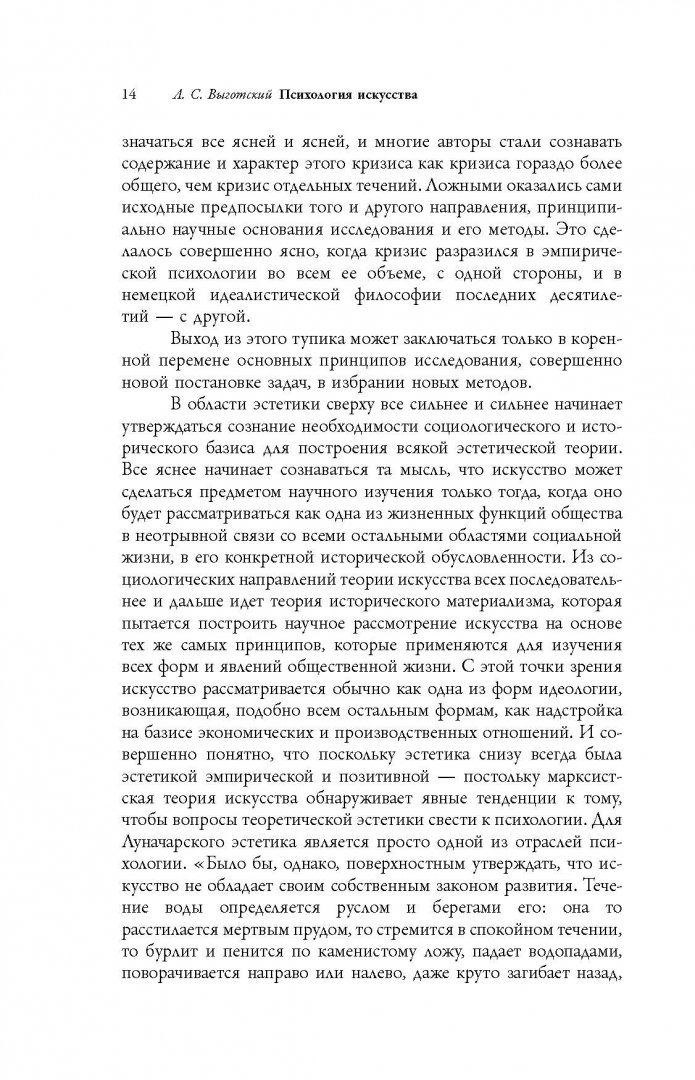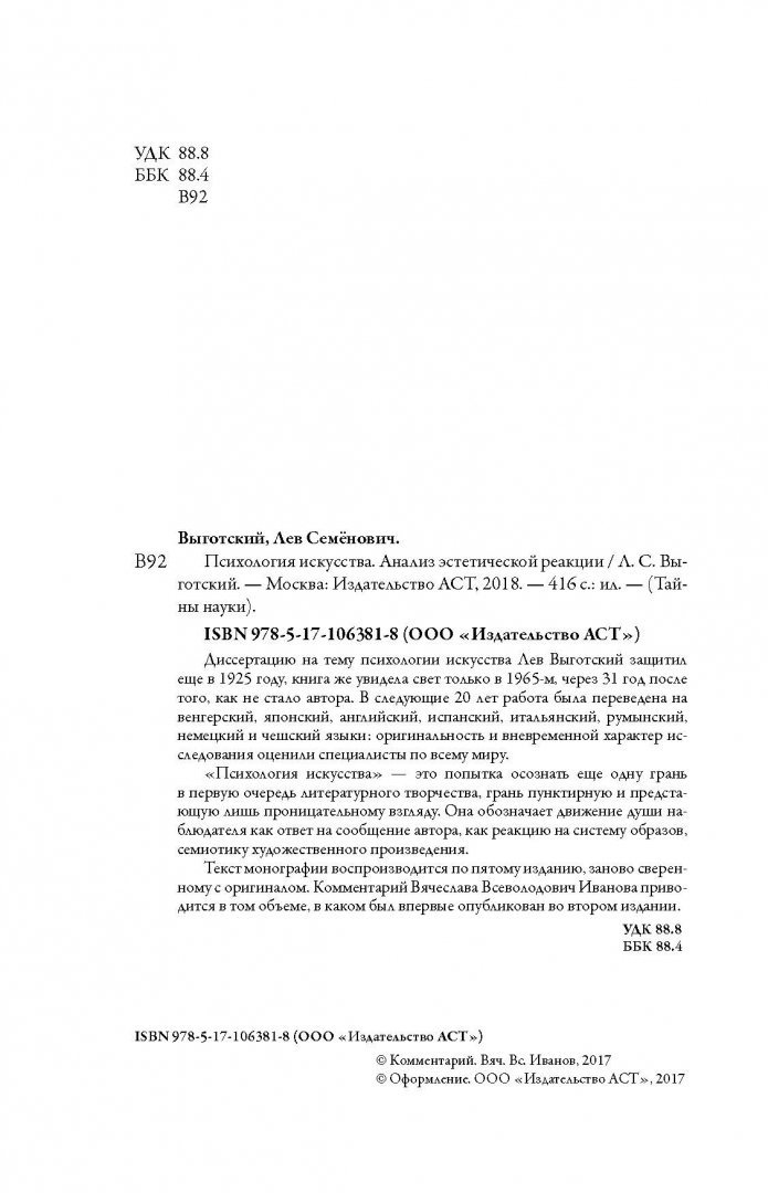 ОписаниеДиссертацию на тему психологии искусства Лев Выготский защитил еще в 1925 году, книга же увидела свет только в 1965-м, через 31 год после того, как не стало автора. В следующие 20 лет работа была переведена на венгерский, японский, английский, испанский, итальянский, румынский, немецкий и чешский языки: оригинальность и вневременной характер исследования оценили специалисты по всему миру."Психология искусства" - это попытка осознать еще одну грань в первую очередь литературного творчества, грань пунктирную и предстающую лишь проницательному взгляду. Она обозначает движение души наблюдателя как ответ на сообщение автора, как реакцию на систему образов, семиотику художественного произведения.Диссертацию на тему психологии искусства Лев Выготский защитил еще в 1925 году, книга же увидела свет только в 1965-м, через 31 год после того, как не стало автора. В следующие 20 лет работа была переведена на венгерский, японский, английский, испанский, итальянский, румынский, немецкий и чешский языки: оригинальность и вневременной характер исследования оценили специалисты по всему миру."Психология искусства" - это попытка осознать еще одну грань в первую очередь литературного творчества, грань пунктирную и предстающую лишь проницательному взгляду. Она обозначает движение души наблюдателя как ответ на сообщение автора, как реакцию на систему образов, семиотику художественного произведения.