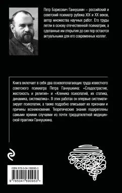 ОписаниеДанная книга включает в себя два основополагающих труда известного советского психиатра Петра Ганнушкина: "Сладострастие, жестокость и религия" и "Клиника психопатий, их статика, динамика, систематика". В этих работах он впервые систематизирует психопатии, а также подробно описывает их признаки и причины возникновения. Теоретические знания подкреплены самыми яркими случаями из почти тридцатилетней медицинской практики Ганнушкина.Данная книга включает в себя два основополагающих труда известного советского психиатра Петра Ганнушкина: "Сладострастие, жестокость и религия" и "Клиника психопатий, их статика, динамика, систематика". В этих работах он впервые систематизирует психопатии, а также подробно описывает их признаки и причины возникновения. Теоретические знания подкреплены самыми яркими случаями из почти тридцатилетней медицинской практики Ганнушкина.