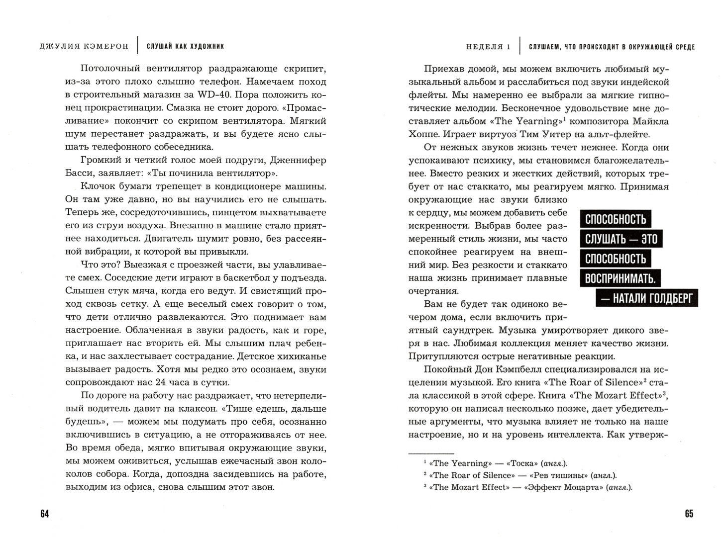 ОписаниеДжулия Кэмерон - автор невероятно успешной книги "Путь художника", которая изменила творческую жизнь миллионов читателей с момента ее первой публикации. Новая книга Джулии "Слушай как художник" - это по-настоящему революционное путешествие к осознанному умению слушать. В течение шести недель читатели получат инструменты, которые помогут им лучше прислушиваться к своему окружению, людям вокруг них и к самим себе.Награда за умение по-настоящему слушать огромна: наше внимание усиливается, и мы обретаем понимание и ясность. Эта книга поможет вам зажечь творческий потенциал, который найдет отклик во всех аспектах вашей жизни.Из этой книги вы узнаете:- Как сделать приятнее звуковую среду вокруг себя (см. Неделя 1).- Как научиться слушать интуицию (см. Неделя 2).- Как стать хорошим слушателем и найти друзей по духу (см. Неделя 3).- Как беседовать с тонким миром (см. Неделя 4).- Как получать поддержку от ваших героев (см. Неделя 5).- Как перестать бояться тишины и находить в ней озарение (см. Неделя 6).Цитаты:"Многие люди просто притворяются, что слушают. Они ждут своей очереди сказать"."Умение слушать - соединительный канал, который позволяет обеим сторонам достичь своих целей"."Слушая, реально слушая, вы показываете, что вам не все равно. Вы помогаете людям и вдохновляете их. Вы узнаете вещи, о которых не знали, - изумительные вещи"."Ключ успешной беседы - взаимность. Если один из собеседников доминирует, возможность слушать правильно утрачивается. Мы должны следовать ритму "сначала ты, потом я". Как в танце"."Слушание - прелюдия к говорению. Вслушиваясь, мы даем своим мыслям обрести ясность и силу".СвернутьДжулия Кэмерон - автор невероятно успешной книги "Путь художника", которая изменила творческую жизнь миллионов читателей с момента ее первой публикации. Новая книга Джулии "Слушай как художник" - это по-настоящему революционное путешествие к осознанному умению слушать. В течение шести недель читатели получат инструменты, которые помогут им лучше прислушиваться к своему окружению, людям вокруг них и к самим себе.Награда за умение по-настоящему слушать огромна: наше внимание усиливается, и мы обретаем понимание и ясность. Эта книга поможет вам зажечь творческий потенциал, который найдет отклик во всех аспектах вашей жизни.Из этой книги вы узнаете:- Как сделать приятнее звуковую среду вокруг себя (см. Неделя 1).- Как научиться слушать интуицию (см. Неделя 2).- Как стать хорошим слушателем и найти друзей по духу (см. Неделя 3).- Как беседовать с тонким миром (см. Неделя 4).- Как получать поддержку от ваших героев (см. Неделя 5).- Как перестать бояться тишины и находить в ней озарение (см. Неделя 6).Цитаты:"Многие люди просто притворяются, что слушают. Они ждут своей очереди сказать"."Умение слушать - соединительный канал, который позволяет обеим сторонам достичь своих целей"."Слушая, реально слушая, вы показываете, что вам не все равно. Вы помогаете людям и вдохновляете их. Вы узнаете вещи, о которых не знали, - изумительные вещи"."Ключ успешной беседы - взаимность. Если один из собеседников доминирует, возможность слушать правильно утрачивается. Мы должны следовать ритму "сначала ты, потом я". Как в танце"."Слушание - прелюдия к говорению. Вслушиваясь, мы даем своим мыслям обрести ясность и силу".СвернутьСвернуть