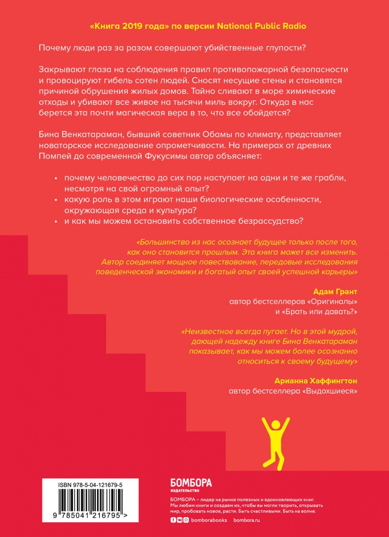 ОписаниеПочему люди раз за разом совершают убийственные глупости? Закрывают глаза на соблюдения правил противопожарной безопасности и провоцируют гибель сотен людей. Сносят во время ремонта несущие стены и становятся причиной обрушения жилых домов. Тайно сливают в море химические отходы и убивают все живое на тысячи миль вокруг. Откуда в нас берется эта почти магическая вера, что все обойдется? Бина Венкатараман, бывший советник Обамы по климату, представляет новаторское исследование опрометчивости. На примерах от древних Помпей до современной Фукусимы автор объясняет: · почему человечество до сих пор наступает на одни и те же грабли, несмотря на свой огромный опыт; · какую роль в этом играют наши биологические особенности, окружающая среда и культура; · и как мы можем остановить собственное безрассудство.Почему люди раз за разом совершают убийственные глупости? Закрывают глаза на соблюдения правил противопожарной безопасности и провоцируют гибель сотен людей. Сносят во время ремонта несущие стены и становятся причиной обрушения жилых домов. Тайно сливают в море химические отходы и убивают все живое на тысячи миль вокруг. Откуда в нас берется эта почти магическая вера, что все обойдется? Бина Венкатараман, бывший советник Обамы по климату, представляет новаторское исследование опрометчивости. На примерах от древних Помпей до современной Фукусимы автор объясняет: · почему человечество до сих пор наступает на одни и те же грабли, несмотря на свой огромный опыт; · какую роль в этом играют наши биологические особенности, окружающая среда и культура; · и как мы можем остановить собственное безрассудство.
