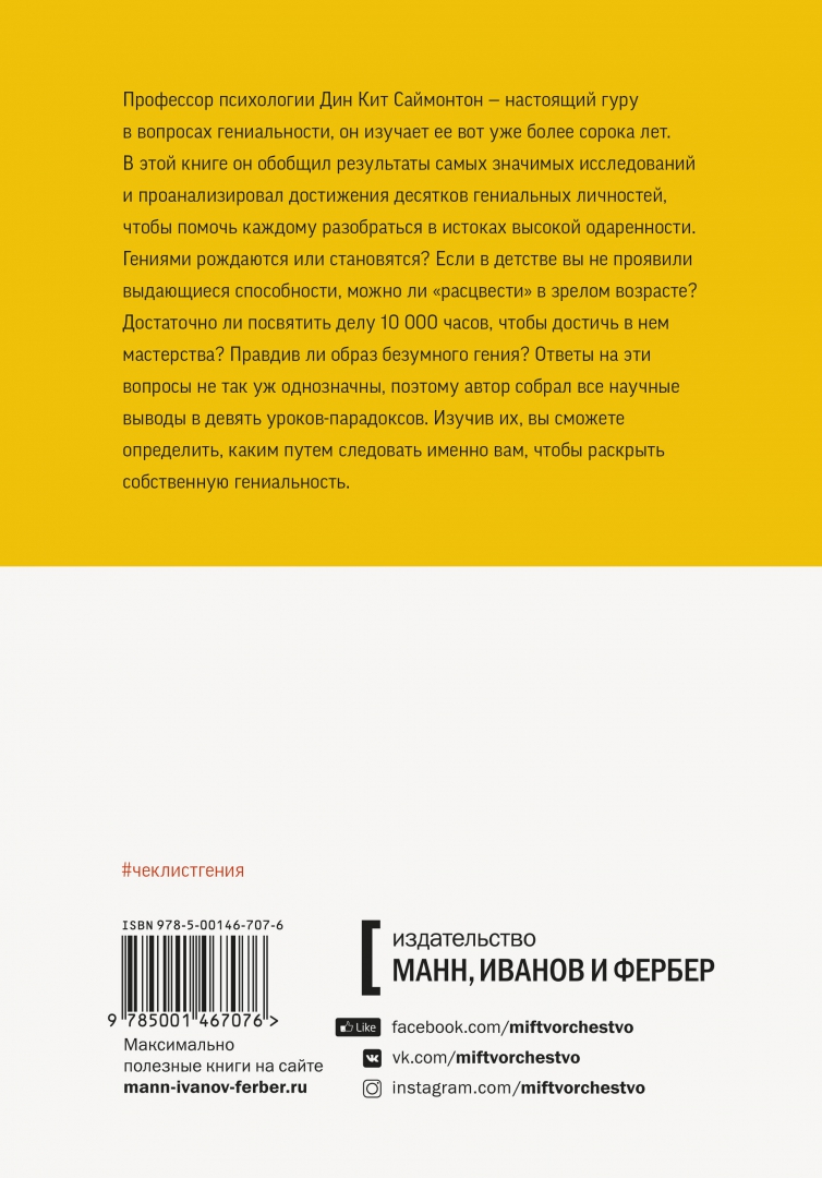 ОписаниеЧто нужно, чтобы стать гением: 9 уроков-парадоксов.Мария Кюри, Альберт Эйнштейн, Александр Флеминг, Генри Форд, Фридрих Ницше, Артур Конан Дойль, Теодор Драйзер, Джон Леннон, Густав Малер, Сергей Прокофьев... Эти люди вошли в историю. Их способности были уникальны. Их жизнь удивляла. Их называли не просто выдающимися — их называли гениями.Но что мы знаем о гениях? Ими рождаются или становятся? Что общего между Альбертом Эйнштейном, Винсентом Ван Гогом и Вирджинией Вулф? И можно ли помочь своему ребенку стать гениальным?Ответы на эти вопросы есть в книге заслуженного профессора психологии Дина Кита Саймонтона. Более четырех десятилетий он изучал эту тему, исследовал биографии известных личностей и сравнивал их IQ. И в итоге написал книгу, в которой ответил на самые волнующие вопросы о гениальности. Он объясняет, возможно ли воспитать своего гения, так ли важен уровень IQ, проводит различие между художественным и научным гением и приводит примеры жизни великих.Для кого эта книгаДля всех, кто хочет лучше понять истоки гениальности и применить эти знания.От автораНесмотря на то что слово «гений» на все лады склоняется в поп-культуре и современных СМИ, чаще всего его используют без какой-либо привязки к научным исследованиям на эту тему. А изучение феномена, между прочим, началось более ста пятидесяти лет назад и продолжается по сей день. Конечно, рядовому читателю все эти научные открытия недоступны. Большинство из них погребено в узкоспециальных журналах под грузом понятной лишь немногим статистики и математики. Я считаю, что основные из них должны быть наконец представлены более широкой аудитории. В этом и состоит одна из главных целей моей книги. И лучший способ сделать это — показать достаточно наглядных примеров и историй из жизни знаменитых гениев.Дороги гениальности порой так запутаны, что кажутся очень противоречивыми. Например, как ответить на вопрос: рождаются гениями или становятся? Наука говорит нам, что бывает по-разному. Однако часто авторы начинают отстаивать одну точку зрения, к примеру убеждая всех в том, что гениями непременно рождаются. Чтобы избежать такого чрезмерного упрощения, я сгруппировал научные выводы в девять парадоксальных утверждений (или уроков), которые раскрывают вопросы гениальности с разных сторон. Какими бы противоречивыми ни казались эти заявления, в каждом из них есть доля истины.В итоге у меня получилось девять уроков-парадоксов, дающих всестороннее понимание того, что нужно, чтобы стать гением. Так что читайте внимательно!СвернутьЧто нужно, чтобы стать гением: 9 уроков-парадоксов.Мария Кюри, Альберт Эйнштейн, Александр Флеминг, Генри Форд, Фридрих Ницше, Артур Конан Дойль, Теодор Драйзер, Джон Леннон, Густав Малер, Сергей Прокофьев... Эти люди вошли в историю. Их способности были уникальны. Их жизнь удивляла. Их называли не просто выдающимися — их называли гениями.Но что мы знаем о гениях? Ими рождаются или становятся? Что общего между Альбертом Эйнштейном, Винсентом Ван Гогом и Вирджинией Вулф? И можно ли помочь своему ребенку стать гениальным?Ответы на эти вопросы есть в книге заслуженного профессора психологии Дина Кита Саймонтона. Более четырех десятилетий он изучал эту тему, исследовал биографии известных личностей и сравнивал их IQ. И в итоге написал книгу, в которой ответил на 