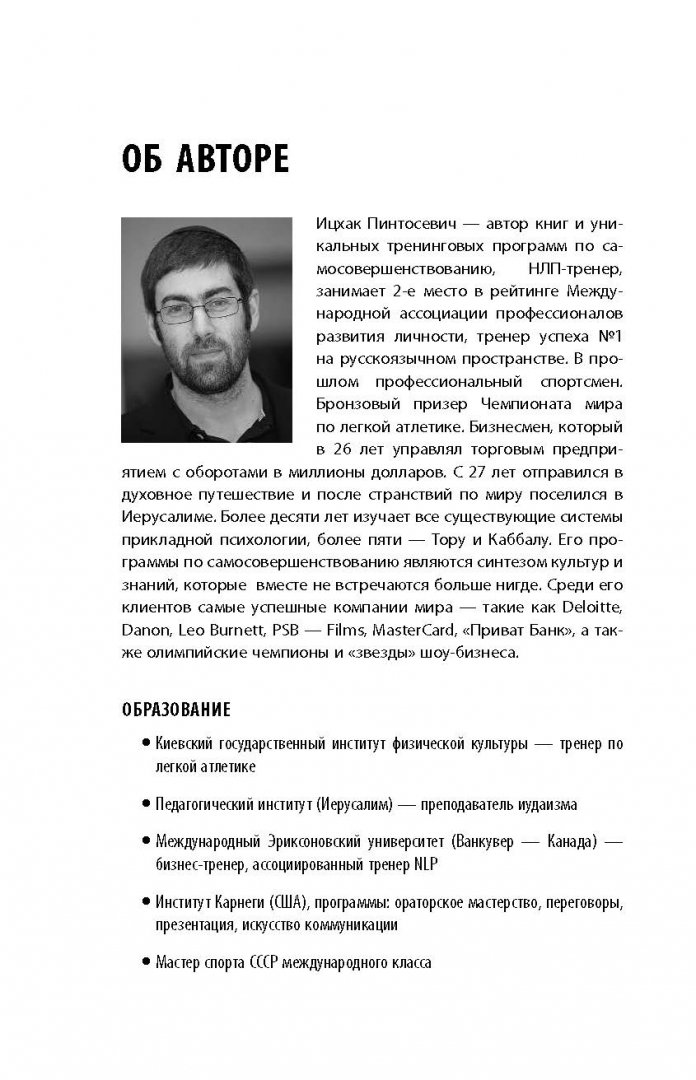 ОписаниеВпервые последние открытия в области психологии, лучшие методики в области личностного роста и менеджмента, секреты подготовки олимпийских чемпионов и законы мироздания из Каббалы объединены в уникальной авторской программе самосовершенствования Ицхака Пинтосевича. Вместо советов - готовая программа действий. Читай эту книгу по 30 минут в день, и ты сможешь укрепить уверенность в себе, добиваться поставленных целей, правильно распределять свое время, преодолевать неудачи, делегировать полномочия, управлять другими. Среди клиентов Ицхака - крупнейшие мировые корпорации Procter & Gamble, Avon, Master Card, Deloitte, а также политики, бизнесмены и "звезды" шоу-бизнеса. Страница Isaac Pintosevich Systems в Facebook насчитывает более 80 000 подписчиков. Специальный бонус для читателей - персональный коучинг от Ицхака Пинтосевича. Подробности - внутри книги.Впервые последние открытия в области психологии, лучшие методики в области личностного роста и менеджмента, секреты подготовки олимпийских чемпионов и законы мироздания из Каббалы объединены в уникальной авторской программе самосовершенствования Ицхака Пинтосевича. Вместо советов - готовая программа действий. Читай эту книгу по 30 минут в день, и ты сможешь укрепить уверенность в себе, добиваться поставленных целей, правильно распределять свое время, преодолевать неудачи, делегировать полномочия, управлять другими. Среди клиентов Ицхака - крупнейшие мировые корпорации Procter & Gamble, Avon, Master Card, Deloitte, а также политики, бизнесмены и "звезды" шоу-бизнеса. Страница Isaac Pintosevich Systems в Facebook насчитывает более 80 000 подписчиков. Специальный бонус для читателей - персональный коучинг от Ицхака Пинтосевича. Подробности - внутри книги.