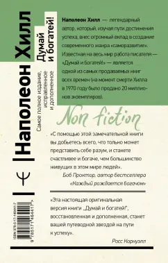 ОписаниеПожалуй, самая значимая и авторитетная книга в мире - руководство по обретению успеха, богатства, жизненной энергии преодоления и целеустремленности. На протяжении более чем 80 лет "Думай и богатей!" считается классическим учебником по созданию богатства. В каждой главе Наполеон Хилл раскрывает секреты, пользуясь которыми, тысячи людей обрели, приумножили и продолжают приумножать свое состояние, одновременно развивая и обогащая свой личностный потенциал.Перед вами новое классическое издание грандиозной работы Наполеона Хилла, дополненное и переработанное с учетом современных реалий.Для самого широкого круга читателей.«Думай и богатей» — эта фраза на слуху у всех, кто стремится к личностному росту, уже на протяжении многих лет. Одноименная книга Наполеона Хилла впервые была опубликована в 1937 году. С тех пор она стала мировым бестселлером и главным руководством для тех, кто хочет жизни на максимум. Что делают самые богатые люди планеты, чего не делают остальные; как приобрести, сохранить и приумножить благосостояние; как сделать карьеру; как открыть свой бизнес; как создать команду, которая будет рваться к победе; как преодолеть трудности и достигнуть цели — все, о чем нужно думать, чтобы разбогатеть, вы найдете в этой книге.