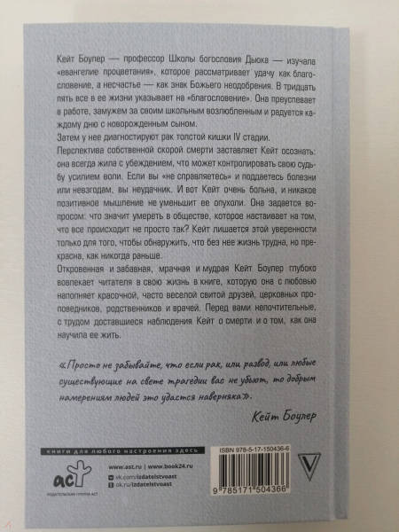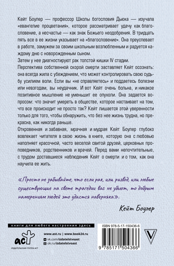 ОписаниеКейт Боулер - профессор Школы богословия Дьюка - изучала "евангелие процветания", которое рассматривает удачу как благословение, а несчастье - как знак Божьего неодобрения. В тридцать пять все в ее жизни указывает на "благословение". Она преуспевает в работе, замужем за своим школьным возлюбленным и радуется каждому дню с новорожденным сыном.Затем у нее диагностируют рак толстой кишки IV стадии. Перспектива собственной скорой смерти заставляет Кейт осознать: она всегда жила с убеждением, что может контролировать свою судьбу усилием воли. Если вы "не справляетесь" и поддаетесь болезни или невзгодам, вы неудачник. И вот Кейт очень больна, и никакое позитивное мышление не уменьшит ее опухоли. Она задается вопросом: что значит умереть в обществе, которое настаивает на том, что все происходит не просто так? Кейт лишается этой уверенности только для того, чтобы обнаружить, что без нее жизнь трудна, но прекрасна, как никогда раньше.Откровенная и забавная, мрачная и мудрая Кейт Боулер глубоко вовлекает читателя в свою жизнь в книге, которую она с любовью наполняет красочной, часто веселой свитой друзей, церковных проповедников, родственников и врачей. Перед вами непочтительные, с трудом доставшиеся наблюдения Кейт о смерти и о том, как она научила ее жить."Просто не забывайте, что если рак, или развод, или любые существующие на свете трагедии вас не убьют, то добрым намерениям людей это удастся наверняка". - Кейт БоулерЧем вы утешаете себя в трудные моменты жизни? И как жить, если все источники утешения уже исчерпаны? Профессор богословия Кейт Боулер серьезно изучает этот вопрос с тех пор, как в возрасте 35 лет столкнулась со страшным диагнозом – раком четвертой стадии. Когда твоя жизнь вот-вот прервется, сохранять веру в высшую справедливость и благо трудно… В этот момент все инструменты позитивного мышления летят в мусорную корзину, а источники утешения, которые дарит нам религия, пересыхают. Автор задается вопросом: что значит умереть в обществе, которое настаивает на том, что все происходит не просто так? С этой книгой вы обретете опору в себе и найдете ответ там, где его вовсе не принято искать.