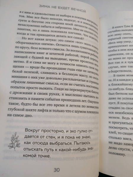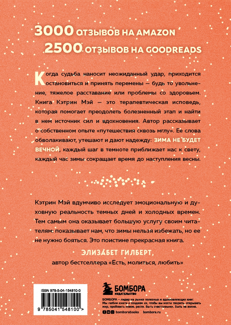 ОписаниеКогда судьба наносит неожиданный удар, приходится остановиться, выдохнуть и принять перемены — будь то увольнение, тяжелое расставание или проблемы со здоровьем. Приходится принять холод, завладевший жизнью, и попробовать изменить отношение к нему. Автор, Кэтрин Мэй, рассказывает, как она сумела пережить болезненный этап своей жизни и даже нашла в нем источник вдохновения и сил. «Зима не будет вечной» — это трогательная, чуткая и медитативная книга о тихой красоте зимы, целительной силе отдыха и важности заботы о себе. А еще — очень важное напоминание о том, что времена года в конце концов сменяют друг друга. «Иногда приходится дать своей личной зиме имя, и имена эти колючим репейником царапают горло: горе, отказ, депрессия, болезнь, стыд, промах, отчаяние». «В жизни многое будет идти не по плану, будут дни душевного и физического подъема и дни, когда мы едва ли сможем встать с постели. И то, и другое — нормально». «За всем этим хаосом и суетой мы не можем уловить и понять, что на самом деле жаждем гораздо более простых вещей: любви, красоты, комфорта, краткого мига забвения». ОТЗЫВЫ: «Книга показывает, что есть некая радость в том, чтобы отпустить, отойти и дать себе время на восстановление в темноте. Мэй — наблюдатель с ясным взором, и ее писательский стиль честен и точен». — The Wall Street Journal «Кэтрин Мэй вдумчиво исследует эмоциональную и духовную реальность темных дней и холодных времен. Тем самым она оказывает большую услугу своим читателям: показывает нам, что зимы нельзя избежать, но ее не нужно бояться. Это поистине прекрасная книга». — Элизабет Гилберт «Прекрасная, затягивающая книга... Такое ощущение, что Кэтрин Мэй открывает именно то, что я и многие другие должны были услышать — но не знали, как назвать». — Криста ТиппеттСвернутьКогда судьба наносит неожиданный удар, приходится остановиться, выдохнуть и принять перемены — будь то увольнение, тяжелое расставание или проблемы со здоровьем. Приходится принять холод, завладевший жизнью, и попробовать изменить отношение к нему. Автор, Кэтрин Мэй, рассказывает, как она сумела пережить болезненный этап своей жизни и даже нашла в нем источник вдохновения и сил. «Зима не будет вечной» — это трогательная, чуткая и медитативная книга о тихой красоте зимы, целительной силе отдыха и важности заботы о себе. А еще — очень важное напоминание о том, что времена года в конце концов сменяют друг друга. «Иногда приходится дать своей личной зиме имя, и имена эти колючим репейником царапают горло: горе, отказ, депрессия, болезнь, стыд, промах, отчаяние». «В жизни многое будет идти не по плану, будут дни душевного и физического подъема и дни, когда мы едва ли сможем встать с постели. И то, и другое — нормально». «За всем этим хаосом и суетой мы не можем уловить и понять, что на самом деле жаждем гораздо более простых вещей: любви, красоты, комфорта, краткого мига забвения». ОТЗЫВЫ: «Книга показывает, что есть некая радость в том, чтобы отпустить, отойти и дать себе время на восстановление в темноте. Мэй — наблюдатель с ясным взором, и ее писательский стиль честен и точен». — The Wall Street Journal «Кэтрин Мэй вдумчиво исследует эмоциональную и духовную реальность темных дней и холодных времен. Тем самым она оказывает большую услугу своим читателям: показывает нам, что зимы нельзя избежать, но ее не нужно боя