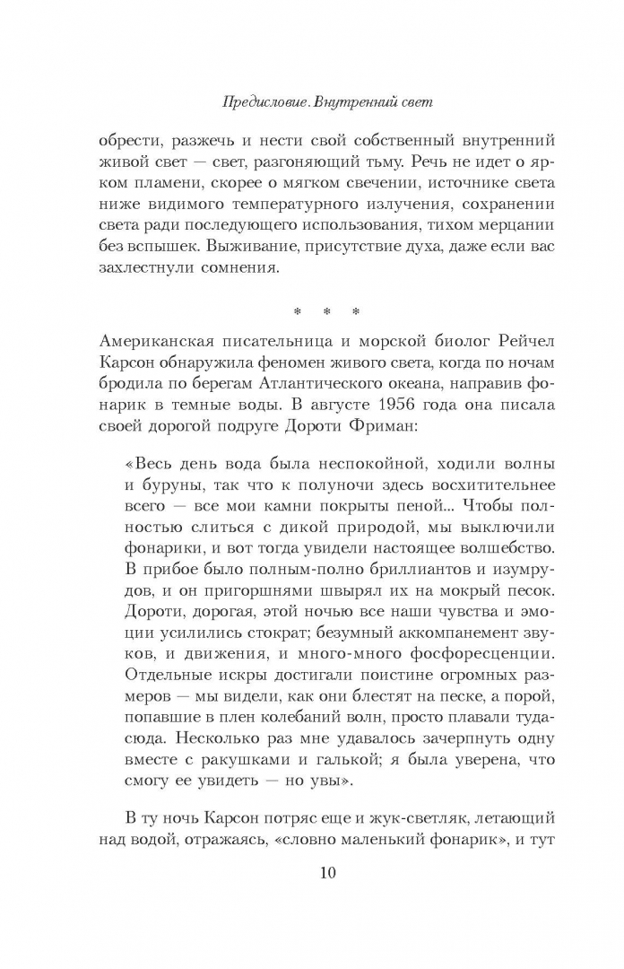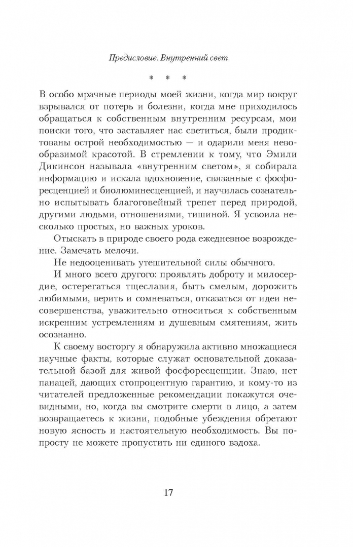 ОписаниеКак выстоять, когда страдания кажутся невыносимыми, а преграды непреодолимыми? Как продолжать сиять, когда выключается свет? Всё, что нам остается, - сделать сначала один шаг вперед, затем второй, выискивать древние тропы и леса, будучи уверенными в том, что другие люди до нас сумели выстоять. Мы должны любить. Мы должны каждый день оглядываться вокруг себя, заботиться о ближних, замечать чудеса, преисполняться благоговением, чтобы найти волшебство, которое будет нас поддерживать и подпитывать наше внутреннее пламя - фосфоресценцию.Как выстоять, когда страдания кажутся невыносимыми, а преграды непреодолимыми? Как продолжать сиять, когда выключается свет? Всё, что нам остается, - сделать сначала один шаг вперед, затем второй, выискивать древние тропы и леса, будучи уверенными в том, что другие люди до нас сумели выстоять. Мы должны любить. Мы должны каждый день оглядываться вокруг себя, заботиться о ближних, замечать чудеса, преисполняться благоговением, чтобы найти волшебство, которое будет нас поддерживать и подпитывать наше внутреннее пламя - фосфоресценцию.