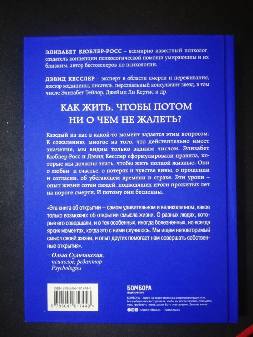 ОписаниеКак жить, чтобы потом ни о чем не жалеть? Каждый из нас в какой-то момент задается этим вопросом. К сожалению, многое из того, что действительно имеет значение, мы видим только задним числом. Известные психологи Элизабет Кюблер-Росс и Дэвид Кесслер сформулировали правила, которые мы должны знать, чтобы жить полной жизнью. Они о любви и счастье, о потерях и чувстве вины, о прощении и согласии, об убегающем времени и страхе. Эти уроки - опыт жизни сотен людей, подводящих итоги прожитых лет на пороге смерти. И потому они бесценны.2-е издание.Как жить, чтобы потом ни о чем не жалеть? Каждый из нас в какой-то момент задается этим вопросом. К сожалению, многое из того, что действительно имеет значение, мы видим только задним числом. Известные психологи Элизабет Кюблер-Росс и Дэвид Кесслер сформулировали правила, которые мы должны знать, чтобы жить полной жизнью. Они о любви и счастье, о потерях и чувстве вины, о прощении и согласии, об убегающем времени и страхе. Эти уроки - опыт жизни сотен людей, подводящих итоги прожитых лет на пороге смерти. И потому они бесценны.2-е издание.