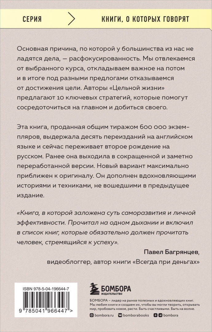 ОписаниеРедкий пример книги по саморазвитию, в которой нет ничего лишнего или бесполезного. Авторы подробно описывают 10 ключевых стратегий, которые не просто помогают достигать своих целей, - они делают жизнь комфортнее, счастливее и продуктивнее. Стратегия № 1. Формируем систему маленьких и больших привычек. Создаем каркас, который позволяет минимизировать усилия на пути к поставленной цели. Стратегия № 2. Фокусируем усилия на том, что у вас получается лучше всего. Остальное делегируем. Стратегия № 3. Учимся видеть картину целиком. Систематизируем свои цели, как в работе, так и в личной жизни, и вводим за правило достигать значимого результата в каждом из направлений раз в 60 дней. Стратегия № 4. Сохраняем жизненный баланс по системе B-Alert. Стратегия № 5. Создаем благоприятную окружающую среду. Перестаем общаться с токсичными людьми и строим взаимодействия по принципу win-win. Стратегия № 6. Формируем подлинную уверенность в себе. Избавляемся от тревоги, связанной с невыполненными обязательствами, фиксируем внимание на своих достижениях. Стратегия № 7. Учимся просить то, что нам нужно. Для этого сначала разбираемся со своим страхом отказов. Стратегия № 8. Проявляем постоянное упорство. Фиксируем внимание на процессе, создавая привычку "делать шаг вперед каждый день". Стратегия № 9. Предпринимаем решительные действия. Здесь авторы предлагают систему упражнений, которые помогают сдвинуть проекты с мертвой точки, начать двигаться вперед прямо сейчас. Стратегия № 10. Начинаем жить ради цели. Книга написана тремя авторами. Самый известный из них, Джек Кэнфилд, - эксперт по достижению успеха, ученик легендарного Наполеона Хилла, автор более 60 книг, переведенных на 39 языков. В том числе знаменитого "Куриного бульона для души", чей тираж в мире уже перевалил за 500 000 000 экземпляров. Ежегодный доход Кэнфилда превышает несколько миллионов долларов. Его имя занесено в Книгу рекордов Гиннесса. Остальные авторы - Марк Виктор Хансен и Лес Хьюитт - являются успешными бизнес-консультантами, коучами, предпринимателями и мотивационными ораторами. ЧИТАТЕЛИ О КНИГЕ "Если вы читаете всего одну книгу в тысячелетие, пусть это будет "Цельная жизнь"". - Харви Маккей, автор книги "Как уцелеть среди акул" ""Цельная жизнь" - совершенно прекрасная книга, и она непременно изменит мир на многие поколения вперед". - Кен Бланшар, соавтор книги "Одноминутный менеджер" "Действенная и очень практичная книга, которая вдохновит вас на воплощение мечты в реальность". - Доктор Барбара де Анжелис, автор книги "Подлинные моменты" "Самые успешные используют проверенные методы. "Цельная жизнь" научит вас поступать именно так". - Вик Конант, президент компании Nightingale-Conant "Ваше умение сосредоточиться на главном - самый важный навык для достижения успеха. Эта книга поможет вам развить его во всех сферах вашей жизни. Это что-то невероятное!" - Брайан Трейси, мотивационный спикер и консультант международного уровня, автор ряда бестселлеров "Многие люди не умеют фокусироваться на главном. Рано или поздно их ждет бедность и разочарование. Эта книга все это изменит". - Джим Рон, самый выдающийся американский бизнес-философ "Эта книга ускорит ваш карьерный рост и одновременно привнесет много счастья и успеха в вашу личную жизнь". - Сомерс Уайт, президент компании Somers White Company, менеджер и финансовый к