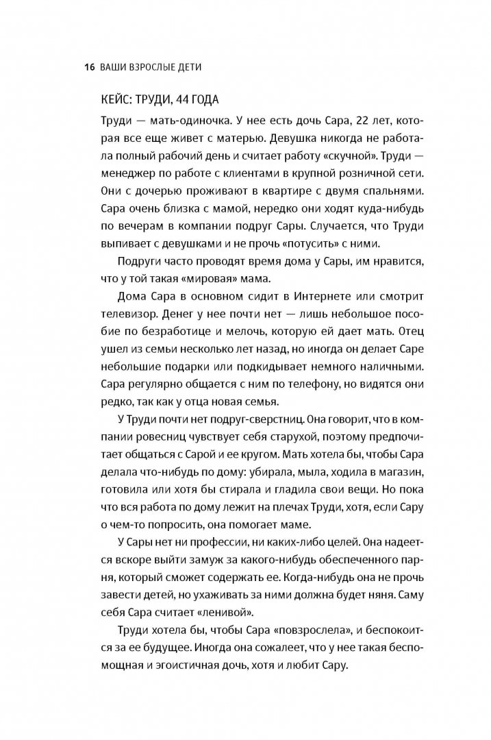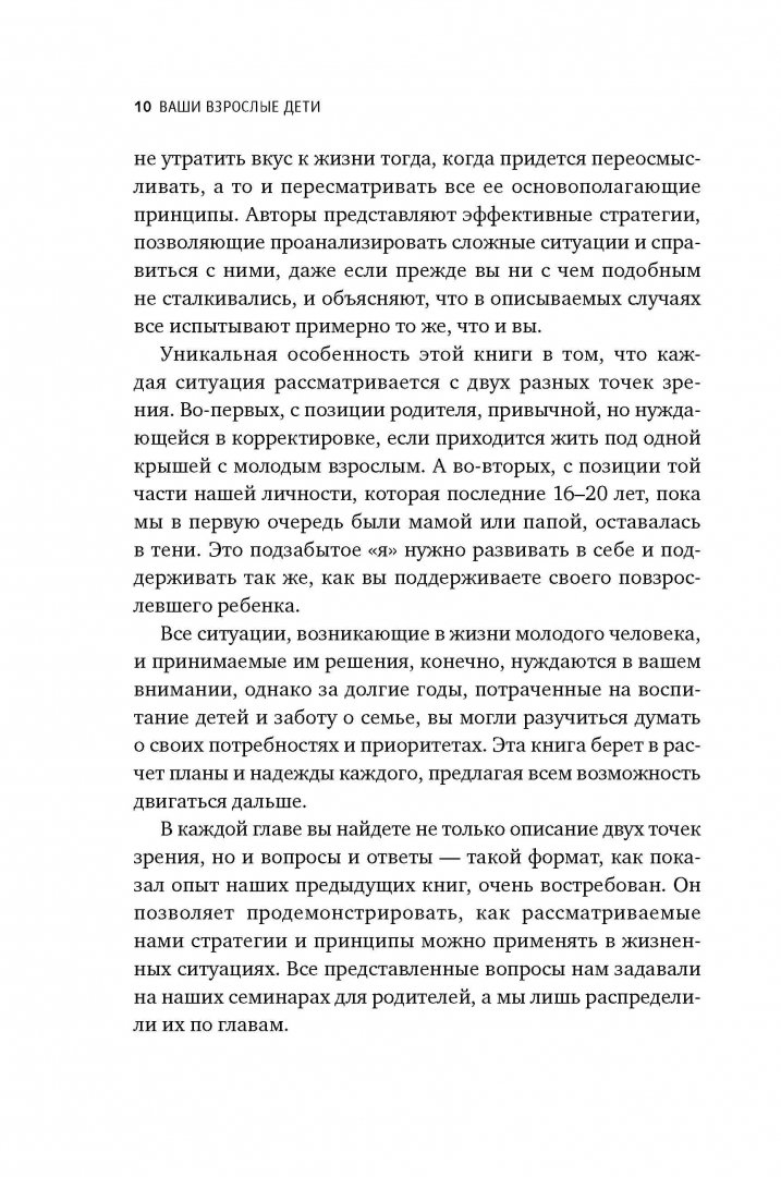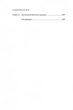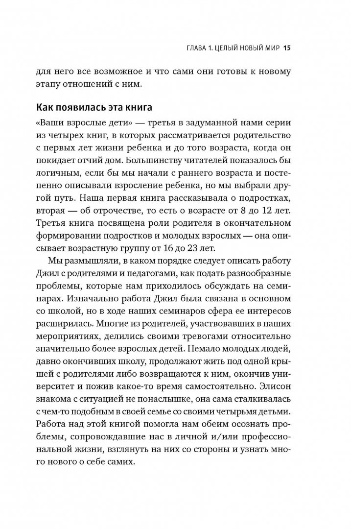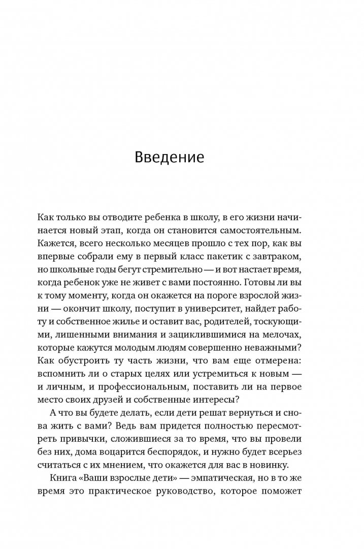 ОписаниеЦитата"Ваши взрослые дети" - книга для родителей, чьим детям от 16 до 23 лет. Это период больших перемен и для молодых людей, и для их мам и пап, когда привычная родительская роль постепенно все заметнее отходит на второй план.Авторы книгиО чем книга "Ваши взрослые дети: Руководство для родителей"Ваш ребенок уже давно обогнал вас по росту, но отнюдь не торопится вести себя по-взрослому, начать жить самостоятельно или хотя бы разделить с вами домашние обязанности? Как подготовить и подтолкнуть его к новому жизненному этапу? Как, признавая его независимость, установить новые границы дозволенного? Наконец, как не переусердствовать, сделав его существование под вашим крылом слишком комфортным? Педагог Джил Хайнс и доктор Элисон Бейверсток, ученый, писатель и мать четверых детей, подскажут ответы на эти и многие другие вопросы. Их книга призвана помочь справиться с конфликтами, неизбежно возникающими во взаимоотношениях со взрослыми детьми, переосмыслить родительскую роль и построить с ними доверительные отношения, которые на долгие годы станут и для них, и для вас источником радости и опорой.Почему эта книга "Ваши взрослые дети: Руководство для родителей" достойна прочтенияЗадача, которую поставили перед собой авторы, - помочь родителям отпустить выросшего ребенка в свободное плавание, будучи уверенными в том, что сделали для него все возможное и что сами они готовы к новому этапу отношений с ним.В каждой главе вы найдете не только описание двух точек зрения, но и вопросы и ответы - именно такой формат, по мнению авторов, позволяет продемонстрировать, как рассматриваемые стратегии и принципы можно применять в разных жизненных ситуациях.Кто авторДжил Хайнс - педагог с огромным стажем: на протяжении более чем 35 лет она работает с родителями, молодыми людьми и подростками, а также учителями, ведет семинары и консультации.Доктор Элисон Бейверсток - ученый, писатель и мать четверых детей. Ранее Джил и Элисон уже написали в соавторстве две книги: "Без разницы! Практическое руководство для родителей подростков" (Whatever! A Down-to-Earth Guide to Parenting Teenagers) и "Это невыносимо! Как растить ребенка, с которым трудно, но интересно" (It's not fair! Parenting the Bright and Challenging Child).СвернутьЦитата"Ваши взрослые дети" - книга для родителей, чьим детям от 16 до 23 лет. Это период больших перемен и для молодых людей, и для их мам и пап, когда привычная родительская роль постепенно все заметнее отходит на второй план.Авторы книгиО чем книга "Ваши взрослые дети: Руководство для родителей"Ваш ребенок уже давно обогнал вас по росту, но отнюдь не торопится вести себя по-взрослому, начать жить самостоятельно или хотя бы разделить с вами домашние обязанности? Как подготовить и подтолкнуть его к новому жизненному этапу? Как, признавая его независимость, установить новые границы дозволенного? Наконец, как не переусердствовать, сделав его существование под вашим крылом слишком комфортным? Педагог Джил Хайнс и доктор Элисон Бейверсток, ученый, писатель и мать четверых детей, подскажут ответы на эти и многие другие вопросы. Их книга призвана помочь справиться с конфликтами, неизбежно возникающими во взаимоотношениях со взрослыми детьми, переосмыслить родительскую роль и построить с ними доверительные отношения, которые на долгие годы станут и для них, и для вас источником радости и опо