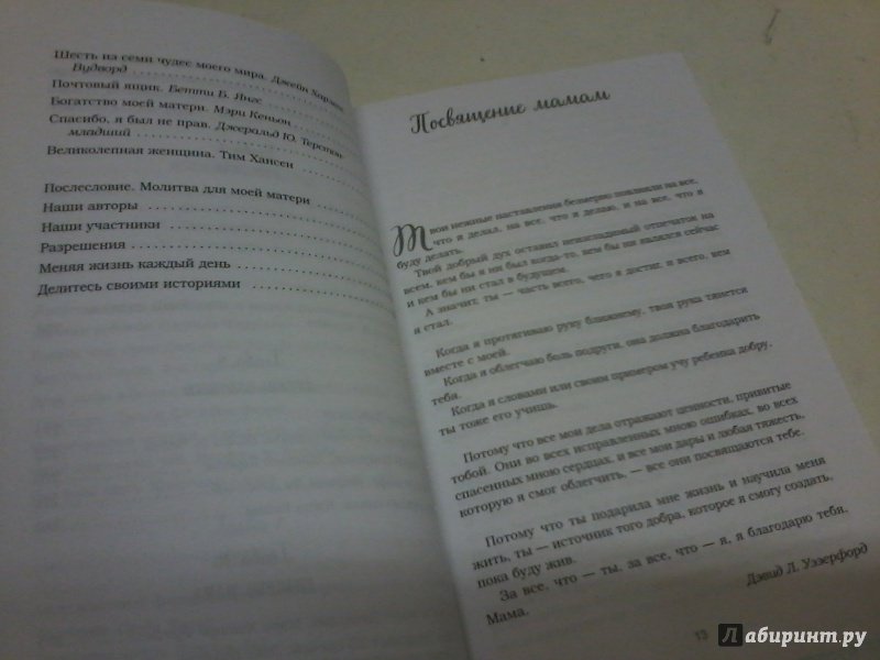 ОписаниеЭто сборник реальных историй о самом чудесном и важном предназначении женщины - быть матерью. Эти истории вдохновят, поддержат и придадут сил, которые так нужны молодым мамам! В день, когда Синди была слишком занята, ее дочь сказала ей нечто важное. Шерон родила не похожего на других ребенка, но он оказался идеальным. Дочка Марши узнала о смешивании цветов от слепой подруги. После смерти родителей Линда узнала, что была усыновленным ребенком. Она чувствовала себя обманутой, но судьба сделала ей настоящий подарок… И другие 97 трогательных историй, от которых вы не сможете оторваться.Это сборник реальных историй о самом чудесном и важном предназначении женщины - быть матерью. Эти истории вдохновят, поддержат и придадут сил, которые так нужны молодым мамам! В день, когда Синди была слишком занята, ее дочь сказала ей нечто важное. Шерон родила не похожего на других ребенка, но он оказался идеальным. Дочка Марши узнала о смешивании цветов от слепой подруги. После смерти родителей Линда узнала, что была усыновленным ребенком. Она чувствовала себя обманутой, но судьба сделала ей настоящий подарок… И другие 97 трогательных историй, от которых вы не сможете оторваться.