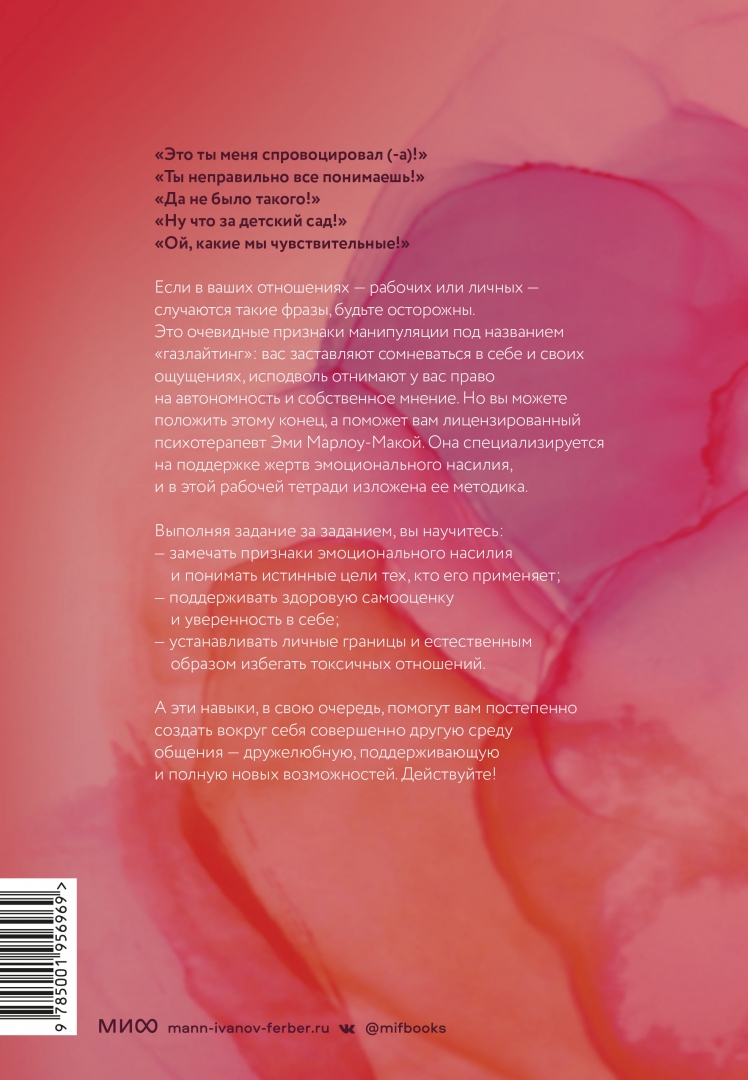 ОписаниеПодробное руководство, которое поможет справиться с последствиями манипуляций и эмоционального насилия. Основное внимание в книге уделено газлайтингу. Это вид эмоционального насилия, когда манипулятор заставляет вас сомневаться в собственном здравомыслии и правильном восприятии действительности. "Ты все преувеличиваешь", "Да разве это обидно? Я же просто шучу", "Ты в своем уме?", "А что я такого сказал(-а)?" — эти и другие фразы использует типичный газлайтер, отрицая проявленную жестокость и убеждая партнера в его (ее) глупости, эмоциональной нестабильности и неадекватности. Материал и упражнения, содержащиеся в книге, помогут исцелиться от последствий таких отношений, восстановить самооценку, почувствовать уверенность и свободу. Книга научит выявлять токсичных людей в своем окружении и вовремя считывать манипуляции; восстанавливаться и приходить в себя после вынужденного взаимодействия с манипулятором; проводить грамотный и глубокий самоанализ и открывать возможности для глубокой работы над собой.СвернутьПодробное руководство, которое поможет справиться с последствиями манипуляций и эмоционального насилия. Основное внимание в книге уделено газлайтингу. Это вид эмоционального насилия, когда манипулятор заставляет вас сомневаться в собственном здравомыслии и правильном восприятии действительности. "Ты все преувеличиваешь", "Да разве это обидно? Я же просто шучу", "Ты в своем уме?", "А что я такого сказал(-а)?" — эти и другие фразы использует типичный газлайтер, отрицая проявленную жестокость и убеждая партнера в его (ее) глупости, эмоциональной нестабильности и неадекватности. Материал и упражнения, содержащиеся в книге, помогут исцелиться от последствий таких отношений, восстановить самооценку, почувствовать уверенность и свободу. Книга научит выявлять токсичных людей в своем окружении и вовремя считывать манипуляции; восстанавливаться и приходить в себя после вынужденного взаимодействия с манипулятором; проводить грамотный и глубокий самоанализ и открывать возможности для глубокой работы над собой.СвернутьСвернуть
