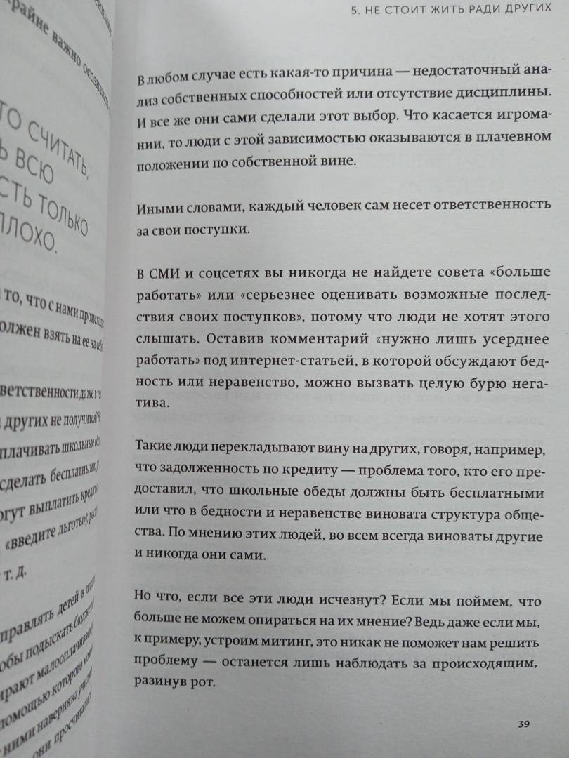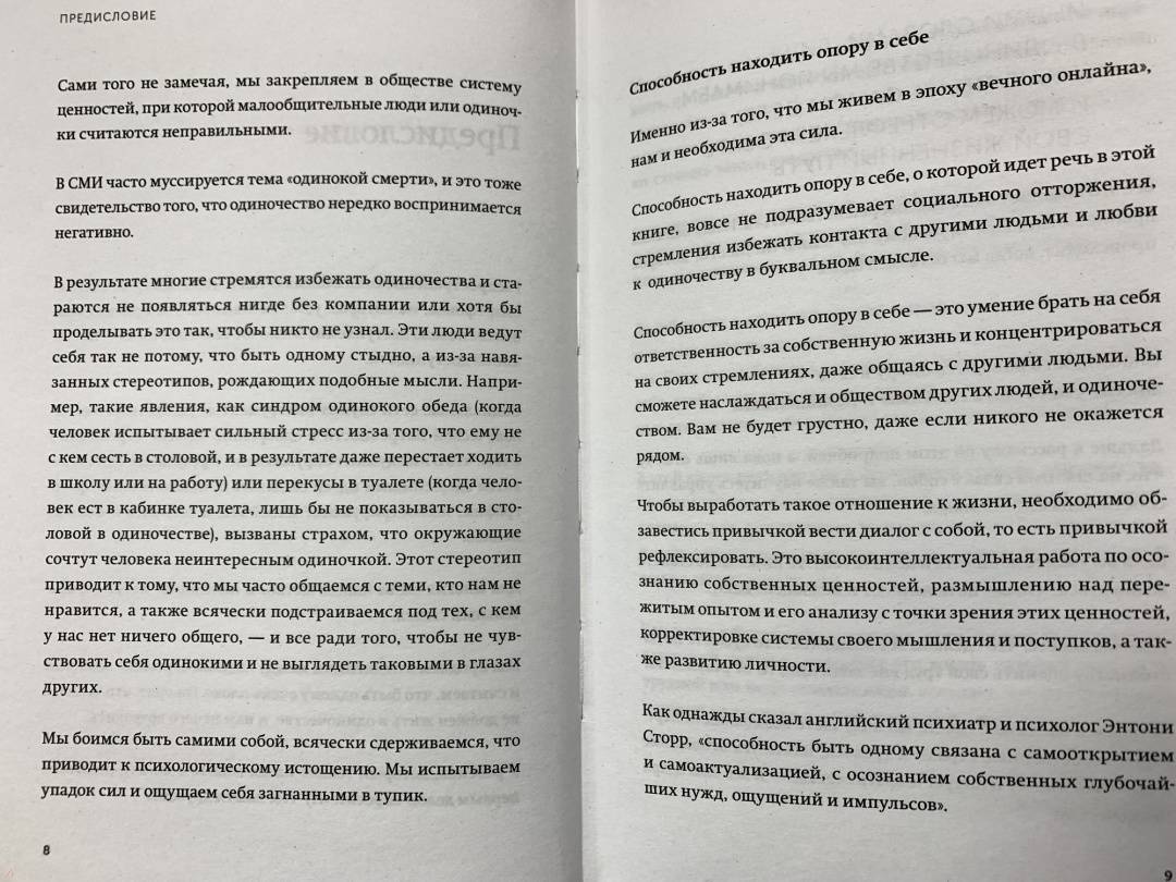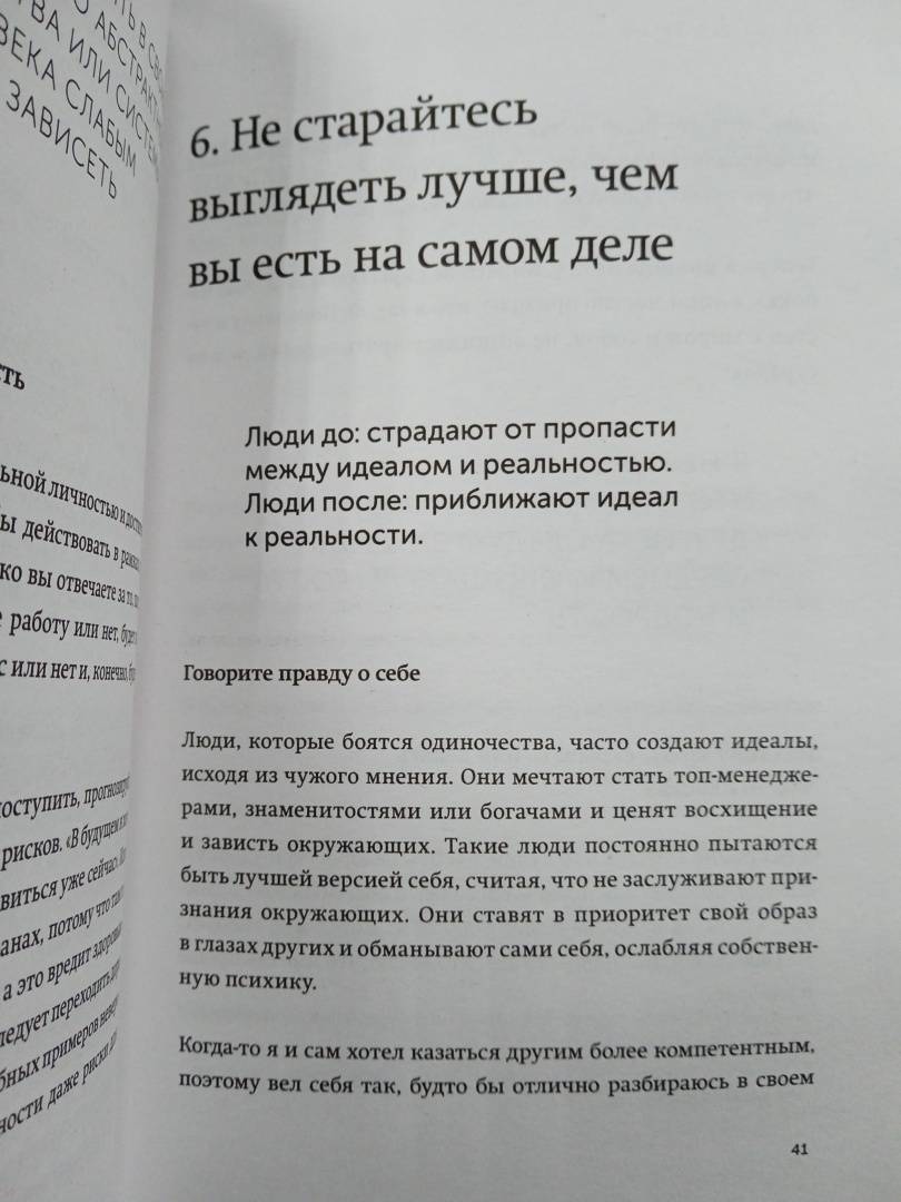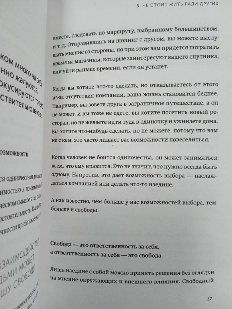 ОписаниеВ четвертой книге серии «Живи настоящую жизнь» автор — известный японский бизнесмен, писатель и спикер — расскажет о том, как поверить в себя и свои силы и действовать, руководствуясь собственными желаниями и потребностями.Мы живем в эпоху онлайна и привыкли, что люди всегда рядом. Мы пропадаем в соцсетях, ищем виртуальной поддержки и грустим, если не получаем ее.Токио Годо предлагает вам обратить внимание на себя и выработать новый подход: «Моя жизнь важнее всего». В четвертой книге серии «Живи настоящую жизнь» вы научитесь вести диалог с собой, анализировать опыт, сможете осознать свои ценности и жить в соответствии с ними.Вы научитесь находить опору в себе. Начнете брать на себя ответственность за собственную жизнь, концентрироваться на своих стремлениях — даже общаясь с другими людьми. Вам не придется поддерживать ненужные отношения. Вы сможете наслаждаться как обществом других людей, так и одиночеством.Не ломайте себя, подстраиваясь под окружающих. Живите своей жизнью и наслаждайтесь ею, даже если прямо сейчас никого нет рядом.Для кого книгаДля тех, кто стремится проанализировать свой опыт, осознать свои ценности и жить в соответствии с ними.Для всех, кто хочет двигаться вперед и быть счастливым.СвернутьВ четвертой книге серии «Живи настоящую жизнь» автор — известный японский бизнесмен, писатель и спикер — расскажет о том, как поверить в себя и свои силы и действовать, руководствуясь собственными желаниями и потребностями.Мы живем в эпоху онлайна и привыкли, что люди всегда рядом. Мы пропадаем в соцсетях, ищем виртуальной поддержки и грустим, если не получаем ее.Токио Годо предлагает вам обратить внимание на себя и выработать новый подход: «Моя жизнь важнее всего». В четвертой книге серии «Живи настоящую жизнь» вы научитесь вести диалог с собой, анализировать опыт, сможете осознать свои ценности и жить в соответствии с ними.Вы научитесь находить опору в себе. Начнете брать на себя ответственность за собственную жизнь, концентрироваться на своих стремлениях — даже общаясь с другими людьми. Вам не придется поддерживать ненужные отношения. Вы сможете наслаждаться как обществом других людей, так и одиночеством.Не ломайте себя, подстраиваясь под окружающих. Живите своей жизнью и наслаждайтесь ею, даже если прямо сейчас никого нет рядом.Для кого книгаДля тех, кто стремится проанализировать свой опыт, осознать свои ценности и жить в соответствии с ними.Для всех, кто хочет двигаться вперед и быть счастливым.СвернутьСвернуть