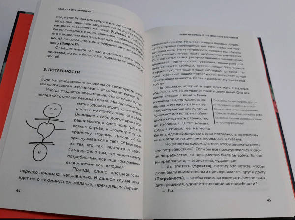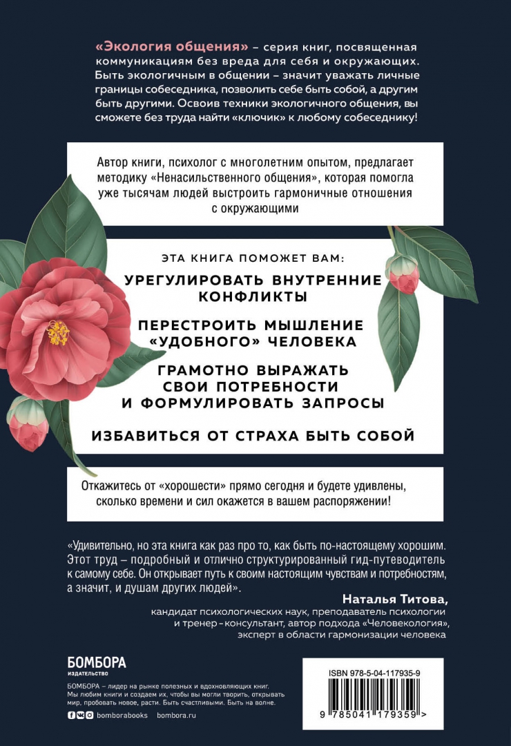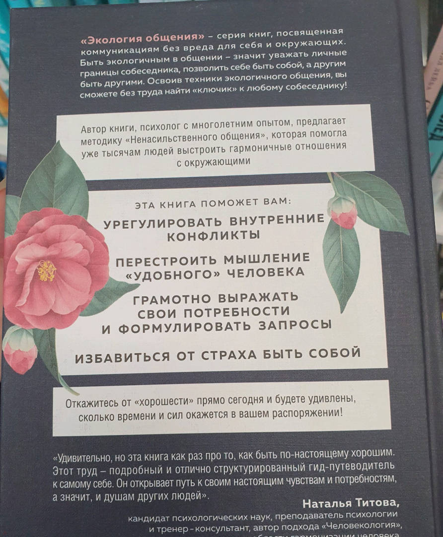 ОписаниеБоитесь говорить "нет"? Хватит игнорировать собственные потребности! Эта книга научит вас улучшать отношения с окружающими, оставаясь самим собой.Все беды от того, что мы так и норовим перекроить себя под ожидания окружающих, считает автор этой книги Тома Д'Ансембур. Делаем не то, что хотим, а то, что, как нам кажется, хотят от нас другие. Отсюда обиды, конфликты, недовольство собственной жизнью и отношением к себе других людей. Как быть? Применять принципы "Ненасильственного общения" - системы, которая помогает разобраться со своими настоящими желаниями и учит правильно формулировать запросы к окружающим.Боитесь говорить "нет"? Хватит игнорировать собственные потребности! Эта книга научит вас улучшать отношения с окружающими, оставаясь самим собой.Все беды от того, что мы так и норовим перекроить себя под ожидания окружающих, считает автор этой книги Тома Д'Ансембур. Делаем не то, что хотим, а то, что, как нам кажется, хотят от нас другие. Отсюда обиды, конфликты, недовольство собственной жизнью и отношением к себе других людей. Как быть? Применять принципы "Ненасильственного общения" - системы, которая помогает разобраться со своими настоящими желаниями и учит правильно формулировать запросы к окружающим.