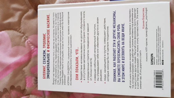 ОписаниеКаждый день мы слышим о нарушении социальных норм: сексуальных домогательствах, коррупции, абьюзе. Слушаем и молчим. Почему хорошие люди так часто ничего не делают, когда, казалось бы, небольшое действие может привести к значительным переменам? Буллинг, троллинг, эмоциональное и физическое насилие - порой мы даже не знаем, как противостоять этому. Заманчиво обвинять злых людей, так мы снимаем ответственность с себя. Но наше бездействие позволяет злу процветать На основании множества проведенных экспериментов социальный психолог-новатор Кэтрин Сандерсон объясняет, почему мы не всегда отстаиваем собственные ценности и идеалы, и показывает, как можно это изменить."Громкое молчание хороших людей" - глубокое практическое руководство, чтобы стать лучшей и более смелой версией самих себя.Каждый день мы слышим о нарушении социальных норм: сексуальных домогательствах, коррупции, абьюзе. Слушаем и молчим. Почему хорошие люди так часто ничего не делают, когда, казалось бы, небольшое действие может привести к значительным переменам? Буллинг, троллинг, эмоциональное и физическое насилие - порой мы даже не знаем, как противостоять этому. Заманчиво обвинять злых людей, так мы снимаем ответственность с себя. Но наше бездействие позволяет злу процветать На основании множества проведенных экспериментов социальный психолог-новатор Кэтрин Сандерсон объясняет, почему мы не всегда отстаиваем собственные ценности и идеалы, и показывает, как можно это изменить."Громкое молчание хороших людей" - глубокое практическое руководство, чтобы стать лучшей и более смелой версией самих себя.