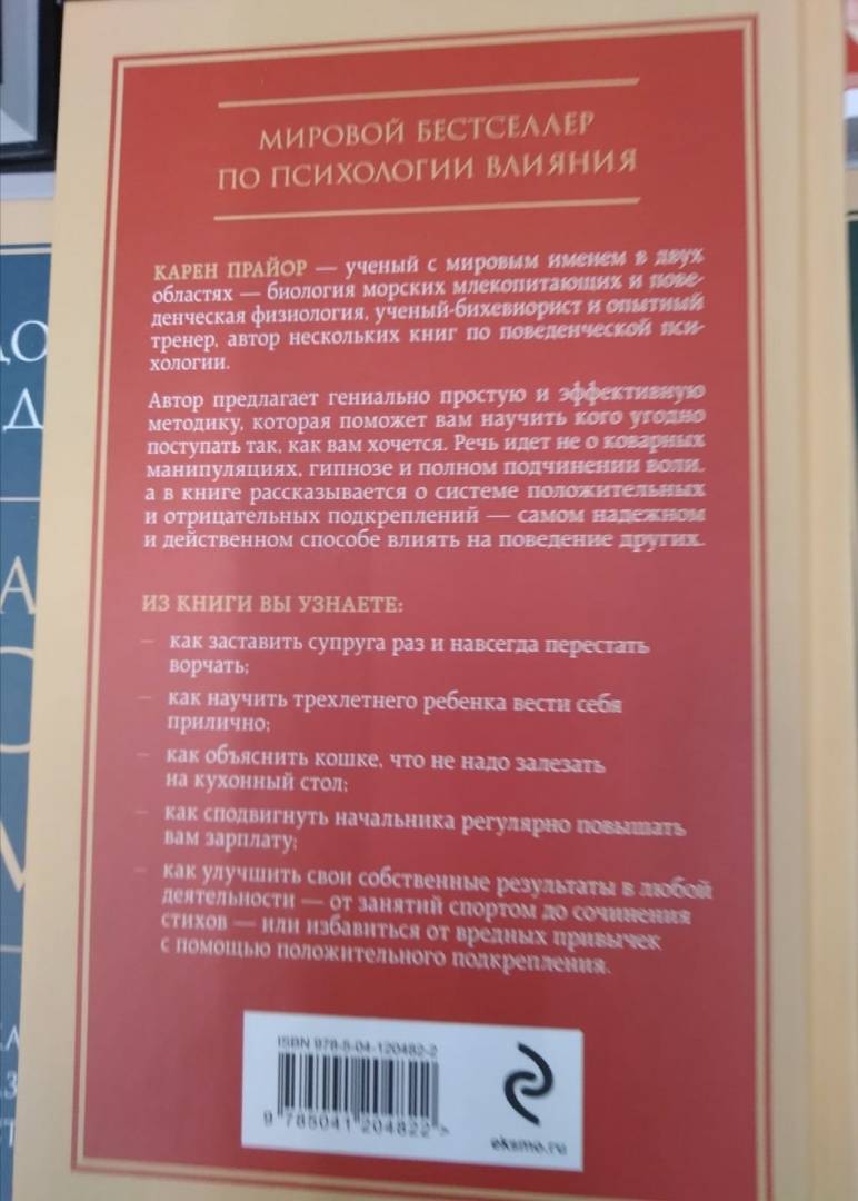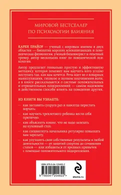 ОписаниеМИРОВОЙ БЕСТСЕЛЛЕР ПО ПСИХОЛОГИИ ВЛИЯНИЯКарен Прайор — ученый с мировым именем в двух областях — биология морских млекопитающих и поведенческая физиология, ученый-бихевиорист и опытный тренер, автор нескольких книг по поведенческой психологии.Автор предлагает гениально простую и эффективную методику, которая поможет вам научить кого угодно поступать так, как вам хочется. Речь идет не о коварных манипуляциях, гипнозе и полном подчинении воли, а в книге рассказывается о системе положительных и отрицательных подкреплений — самом надёжном и действенном способе влиять на поведение другихИз книги вы узнаете:- как заставить супруга раз и навсегда перестать ворчать;- как научить трехлетнего ребенка вести себя прилично; - как объяснить кошке, что не надо залезать на кухонный стол; - как сподвигнуть начальника регулярно повышать вам зарплату; - как улучшить свои собственные результаты в любой деятельности – от занятий спортом до сочинения стихов или избавиться от вредных привычек с помощью положительного подкрепления.СвернутьМИРОВОЙ БЕСТСЕЛЛЕР ПО ПСИХОЛОГИИ ВЛИЯНИЯКарен Прайор — ученый с мировым именем в двух областях — биология морских млекопитающих и поведенческая физиология, ученый-бихевиорист и опытный тренер, автор нескольких книг по поведенческой психологии.Автор предлагает гениально простую и эффективную методику, которая поможет вам научить кого угодно поступать так, как вам хочется. Речь идет не о коварных манипуляциях, гипнозе и полном подчинении воли, а в книге рассказывается о системе положительных и отрицательных подкреплений — самом надёжном и действенном способе влиять на поведение другихИз книги вы узнаете:- как заставить супруга раз и навсегда перестать ворчать;- как научить трехлетнего ребенка вести себя прилично; - как объяснить кошке, что не надо залезать на кухонный стол; - как сподвигнуть начальника регулярно повышать вам зарплату; - как улучшить свои собственные результаты в любой деятельности – от занятий спортом до сочинения стихов или избавиться от вредных привычек с помощью положительного подкрепления.СвернутьСвернуть