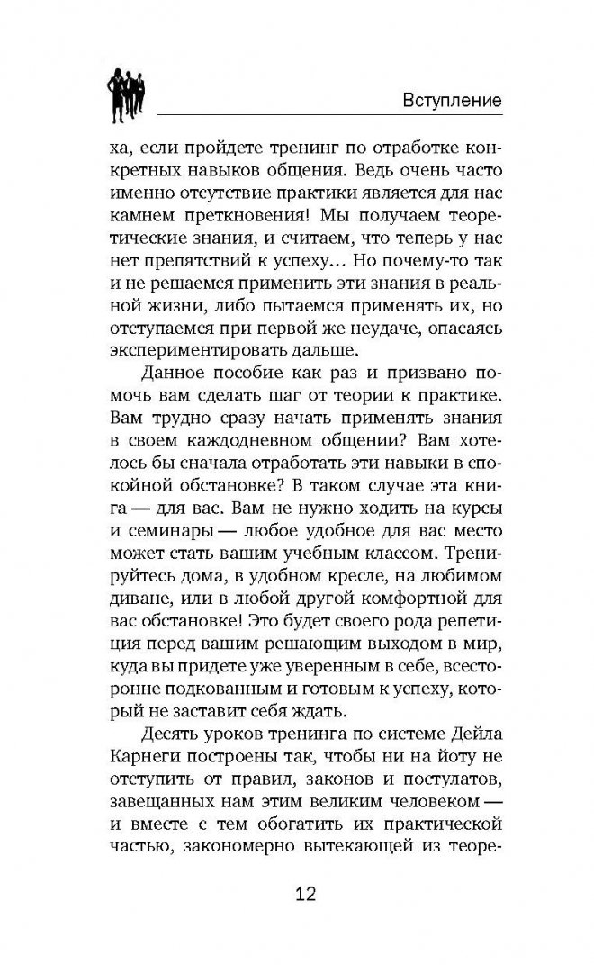 ОписаниеСоветы Карнеги, как правильно общаться, изменили к лучшему жизнь миллионов людей в Америке, Европе и России. Это число наверняка увеличилось бы, если читатели получили бы упражнения, с помощью которых они могли накрепко "внедрить" эти советы в свою жизнь, свое создание! Такая книга создана. Она перед вами!Здесь вы найдете 10 уроков по системе Карнеги. Эти уроки насыщены упражнениями, выполняя которые вы существенно повысите уровень своего общения.Настольная книга для тех, кто действительно хочет научиться общаться!Советы Карнеги, как правильно общаться, изменили к лучшему жизнь миллионов людей в Америке, Европе и России. Это число наверняка увеличилось бы, если читатели получили бы упражнения, с помощью которых они могли накрепко "внедрить" эти советы в свою жизнь, свое создание! Такая книга создана. Она перед вами!Здесь вы найдете 10 уроков по системе Карнеги. Эти уроки насыщены упражнениями, выполняя которые вы существенно повысите уровень своего общения.Настольная книга для тех, кто действительно хочет научиться общаться!