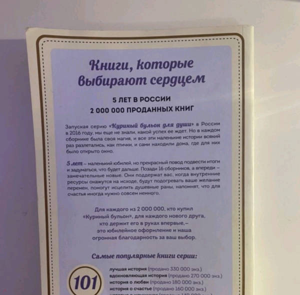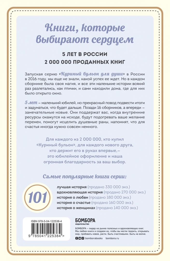 ОписаниеВ детстве, когда вы болели, ваша бабушка давала вам куриный бульон. Сегодня питание и забота нужны вашей душе. Маленькие истории из "Куриного бульона" - исцелят душевные раны и укрепят дух, дадут вашим мечтам новые крылья и откроют секрет самого большого счастья - счастья делиться и любить. Что делать, если ты влюбился и ты…. монах. Чем заканчивается свидание, которое начинается с разбитой фары. Оригинальный способ встретить Принца - коллекционировать лягушат. Разведенная женщина 33 лет встречает первую любовь - школьного учителя. Как не отчаяться, когда все вокруг выходят замуж, а ты все ждешь. Чем больше детей, тем меньше романтики - или наоборот?! И другие 95 волнующих историй о любви, от которых вы не сможете оторваться.В детстве, когда вы болели, ваша бабушка давала вам куриный бульон. Сегодня питание и забота нужны вашей душе. Маленькие истории из "Куриного бульона" - исцелят душевные раны и укрепят дух, дадут вашим мечтам новые крылья и откроют секрет самого большого счастья - счастья делиться и любить. Что делать, если ты влюбился и ты…. монах. Чем заканчивается свидание, которое начинается с разбитой фары. Оригинальный способ встретить Принца - коллекционировать лягушат. Разведенная женщина 33 лет встречает первую любовь - школьного учителя. Как не отчаяться, когда все вокруг выходят замуж, а ты все ждешь. Чем больше детей, тем меньше романтики - или наоборот?! И другие 95 волнующих историй о любви, от которых вы не сможете оторваться.