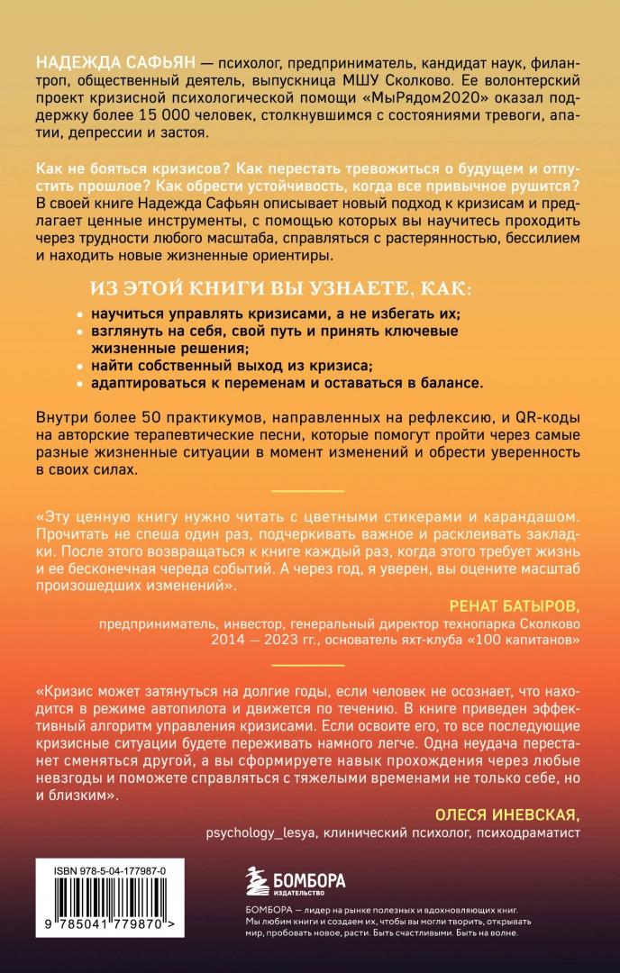 ОписаниеНадежда Сафьян - психолог, предприниматель, кандидат наук, филантроп, общественный деятель, выпускница МШУ Сколково. Ее волонтерский проект кризисной психологической помощи "МыРядом2020" оказал поддержку более 15 000 человек, столкнувшимся с состояниями тревоги, апатии, депрессии и застоя. Как не бояться кризисов? Как перестать тревожится о будущем и отпустить прошлое? Как обрести устойчивость, когда все привычное рушится? В своей книге Надежда Сафьян описывает новый подход к кризисам и предлагает ценные инструменты, с помощью которых вы научитесь проходить через кризисы любого масштаба, справляться с растерянностью, бессилием и находить новые жизненные ориентиры. Из этой книги вы узнаете как:научиться управлять кризисами, а не избегать их;взглянуть на себя, свой путь и принять ключевые жизненные решения;найти собственный выход из кризиса;адаптироваться к жизненным переменам и оставаться в балансе.Внутри более 50 практикумов, направленных на рефлексию, и QR коды на авторские терапевтические песни, которые помогут преодолеть самые разные жизненные ситуации в момент перемен и обрести уверенность в своих силах.СвернутьНадежда Сафьян - психолог, предприниматель, кандидат наук, филантроп, общественный деятель, выпускница МШУ Сколково. Ее волонтерский проект кризисной психологической помощи "МыРядом2020" оказал поддержку более 15 000 человек, столкнувшимся с состояниями тревоги, апатии, депрессии и застоя. Как не бояться кризисов? Как перестать тревожится о будущем и отпустить прошлое? Как обрести устойчивость, когда все привычное рушится? В своей книге Надежда Сафьян описывает новый подход к кризисам и предлагает ценные инструменты, с помощью которых вы научитесь проходить через кризисы любого масштаба, справляться с растерянностью, бессилием и находить новые жизненные ориентиры. Из этой книги вы узнаете как:научиться управлять кризисами, а не избегать их;взглянуть на себя, свой путь и принять ключевые жизненные решения;найти собственный выход из кризиса;адаптироваться к жизненным переменам и оставаться в балансе.Внутри более 50 практикумов, направленных на рефлексию, и QR коды на авторские терапевтические песни, которые помогут преодолеть самые разные жизненные ситуации в момент перемен и обрести уверенность в своих силах.СвернутьСвернуть