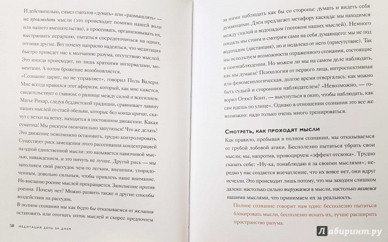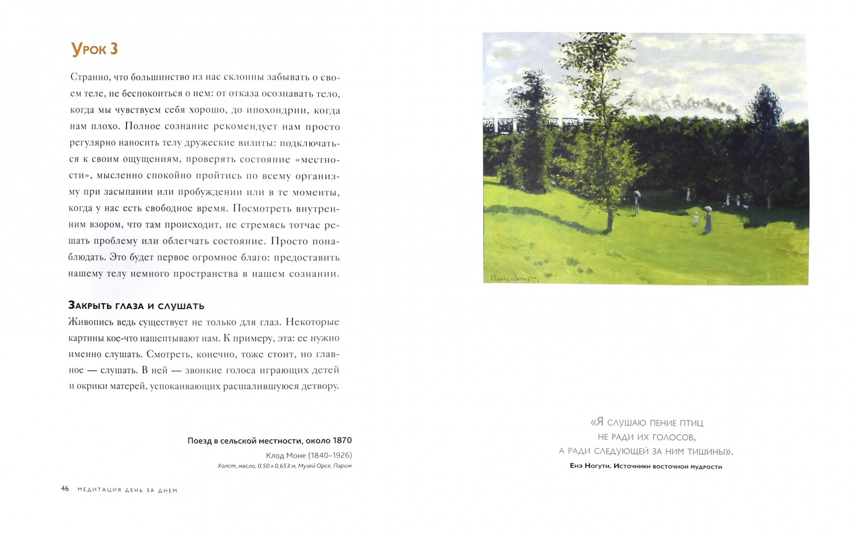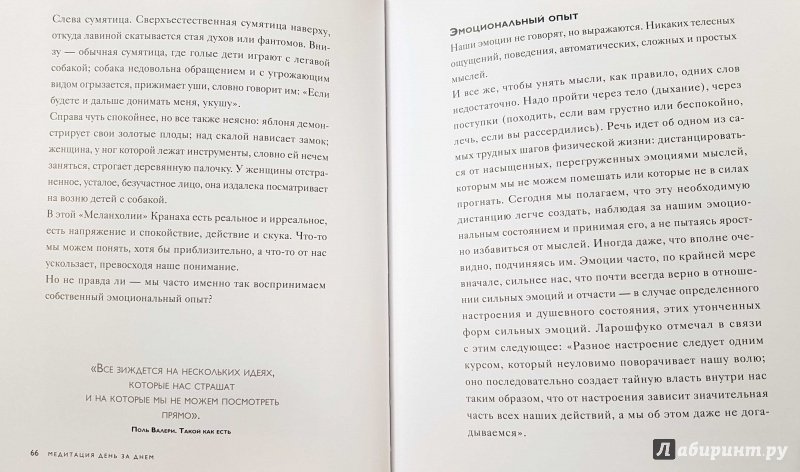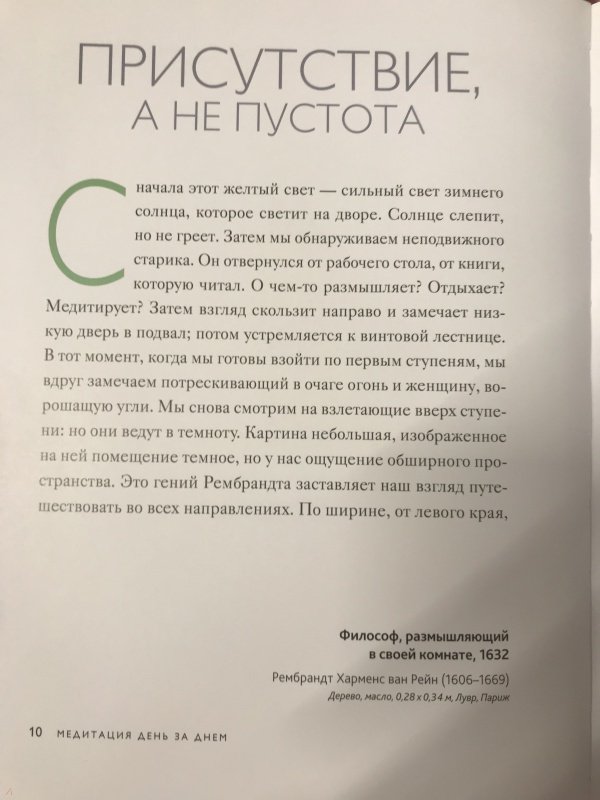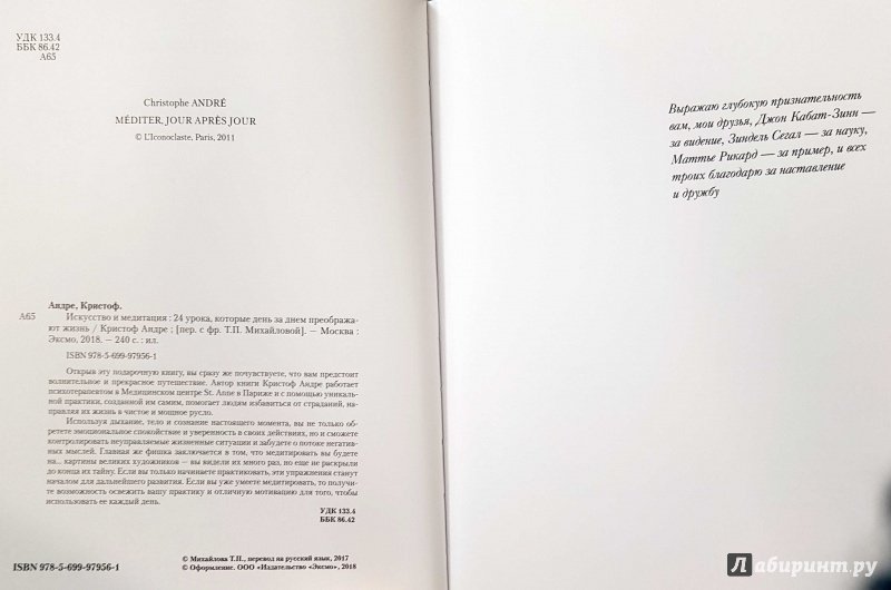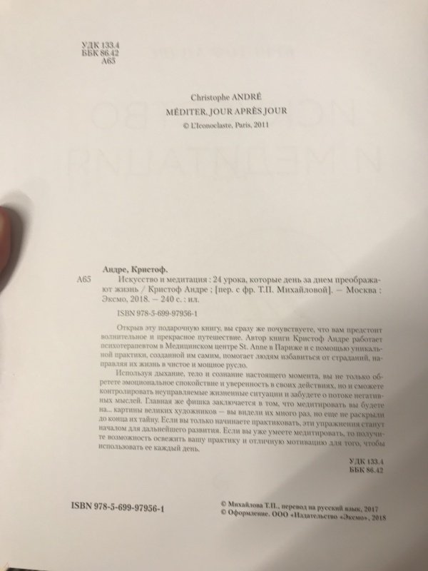 ОписаниеОткрыв эту подарочную книгу, вы сразу же почувствуете, что вам предстоит волнительное и прекрасное путешествие. Автор книги Кристоф Андре работает психотерапевтом в Медицинском центре St. Anne в Париже и с помощью уникальной практики, созданной им самим, помогает людям избавиться от страданий, направляя их жизнь в чистое и мощное русло. Используя дыхание, тело и сознание настоящего момента, вы не только обретете эмоциональное спокойствие и уверенность в своих действиях, но и сможете контролировать неуправляемые жизненные ситуации и забудете о потоке негативных мыслей. Главная же фишка заключается в том, что медитировать вы будете на... картины великих художников - вы видели их много раз, но еще не раскрыли до конца их тайну. Если вы только начинаете практиковать, эти упражнения станут началом для дальнейшего развития. Если вы уже умеете медитировать, то получите возможность освежить вашу практику и отличную мотивацию для того, чтобы использовать ее каждый день.Открыв эту подарочную книгу, вы сразу же почувствуете, что вам предстоит волнительное и прекрасное путешествие. Автор книги Кристоф Андре работает психотерапевтом в Медицинском центре St. Anne в Париже и с помощью уникальной практики, созданной им самим, помогает людям избавиться от страданий, направляя их жизнь в чистое и мощное русло. Используя дыхание, тело и сознание настоящего момента, вы не только обретете эмоциональное спокойствие и уверенность в своих действиях, но и сможете контролировать неуправляемые жизненные ситуации и забудете о потоке негативных мыслей. Главная же фишка заключается в том, что медитировать вы будете на... картины великих художников - вы видели их много раз, но еще не раскрыли до конца их тайну. Если вы только начинаете практиковать, эти упражнения станут началом для дальнейшего развития. Если вы уже умеете медитировать, то получите возможность освежить вашу практику и отличную мотивацию для того, чтобы использовать ее каждый день.
