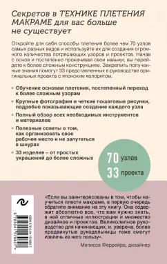 ОписаниеУникальный справочник по японской технологии плетения узлов и узоров макраме в серии книг, предназначенных для повышения уровня мастерства! В нашей повседневной жизни мы постоянно плетем узлы, абсолютно об этом не задумываясь, делая это автоматически. Но что, если посмотреть на это действие не только с практической, но и с эстетической стороны? Ведь стоит только переплести одну нить с другой и затянуть в узел - это и будет основа макраме. Техника макраме - безграничное поле для творческой реализации. При этом вам не потребуется практически ничего кроме мотка шнура и, ну разве что, нескольких простых инструментов. Как пользоваться этой книгой? Все очень просто: В Главе 1 вы найдете всю необходимую информацию о материалах и базовых инструментах, необходимых для начала работы. Из нее вы узнаете о нитях, полезных лайфхаках и способах спланировать, начать и завершить работу над вашим изделием. Глава 2 - ваш путеводитель по плетению узлов и узоров. Откройте для себя технику плетения более чем 70 узлов макраме, а затем используйте их для создания огромного количества потрясающих изделий. В Главе 3 представлены примеры готовых изделий и советы по выбору шнура нужного типа и цветов. Эта книга станет вашим проводником в мир множества творческих возможностей и вдохновит повторить уже увиденные идеи или же создать собственные. Для начала просто пролистайте страницы и найдите узор, а может, два или три, которые находят отклик в вашем сердце.СвернутьУникальный справочник по японской технологии плетения узлов и узоров макраме в серии книг, предназначенных для повышения уровня мастерства! В нашей повседневной жизни мы постоянно плетем узлы, абсолютно об этом не задумываясь, делая это автоматически. Но что, если посмотреть на это действие не только с практической, но и с эстетической стороны? Ведь стоит только переплести одну нить с другой и затянуть в узел - это и будет основа макраме. Техника макраме - безграничное поле для творческой реализации. При этом вам не потребуется практически ничего кроме мотка шнура и, ну разве что, нескольких простых инструментов. Как пользоваться этой книгой? Все очень просто: В Главе 1 вы найдете всю необходимую информацию о материалах и базовых инструментах, необходимых для начала работы. Из нее вы узнаете о нитях, полезных лайфхаках и способах спланировать, начать и завершить работу над вашим изделием. Глава 2 - ваш путеводитель по плетению узлов и узоров. Откройте для себя технику плетения более чем 70 узлов макраме, а затем используйте их для создания огромного количества потрясающих изделий. В Главе 3 представлены примеры готовых изделий и советы по выбору шнура нужного типа и цветов. Эта книга станет вашим проводником в мир множества творческих возможностей и вдохновит повторить уже увиденные идеи или же создать собственные. Для начала просто пролистайте страницы и найдите узор, а может, два или три, которые находят отклик в вашем сердце.СвернутьСвернуть