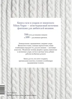 ОписаниеКнига схем и узоров от японского Nihon Vogue — неисчерпаемый источник фантазии для любителей вязания. 700 схем для вязания спицами и 300 — для вязания крючком. Универсальные, традиционные, ажурные узоры. Множество техник, сложные переплетения, новые комбинации порадуют тех, для кого вязание — настоящее искусство. Мозаичные мотивы, ферайл и араны, извилистые и лиственные узоры, клетка и цветные косы добавят работам необычных деталей. Книга для тех, кто хочет создавать оригинальные полотна, усложняя и комбинируя традиционные техники.Книга схем и узоров от японского Nihon Vogue — неисчерпаемый источник фантазии для любителей вязания. 700 схем для вязания спицами и 300 — для вязания крючком. Универсальные, традиционные, ажурные узоры. Множество техник, сложные переплетения, новые комбинации порадуют тех, для кого вязание — настоящее искусство. Мозаичные мотивы, ферайл и араны, извилистые и лиственные узоры, клетка и цветные косы добавят работам необычных деталей. Книга для тех, кто хочет создавать оригинальные полотна, усложняя и комбинируя традиционные техники.