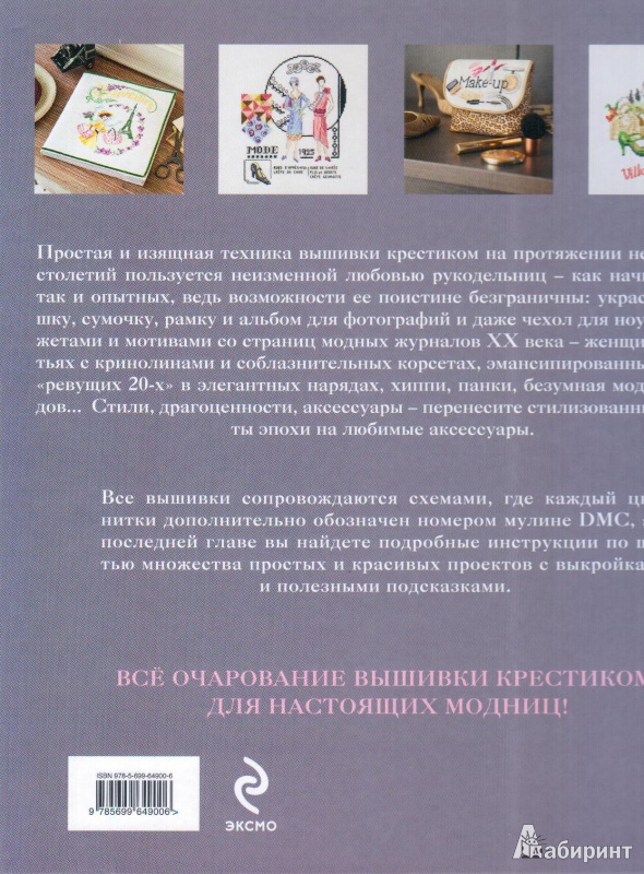 ОписаниеЖенщины в платьях с кринолинами и соблазнительных корсетах, эмансипированные девицы "ревущих 20-х" в элегантных нарядах, хиппи, панки, безумная мода 90-х годов... Стили, драгоценности, аксессуары - можно часами рассматривать модные картинки ушедших эпох. Вышейте их крестиком и украсьте вышивкой любимые аксессуары! Каждый цвет в схемах для вышивки дополнительно обозначен номером мулине DMC. В последней главе вы найдете инструкции по шитью множества простых и красивых проектов: подушки, сумки, рамки и альбомы для фотографий и даже чехол для ноутбука! Побывайте на модном дефиле, представляющем наряды всех эпох!Женщины в платьях с кринолинами и соблазнительных корсетах, эмансипированные девицы "ревущих 20-х" в элегантных нарядах, хиппи, панки, безумная мода 90-х годов... Стили, драгоценности, аксессуары - можно часами рассматривать модные картинки ушедших эпох. Вышейте их крестиком и украсьте вышивкой любимые аксессуары! Каждый цвет в схемах для вышивки дополнительно обозначен номером мулине DMC. В последней главе вы найдете инструкции по шитью множества простых и красивых проектов: подушки, сумки, рамки и альбомы для фотографий и даже чехол для ноутбука! Побывайте на модном дефиле, представляющем наряды всех эпох!