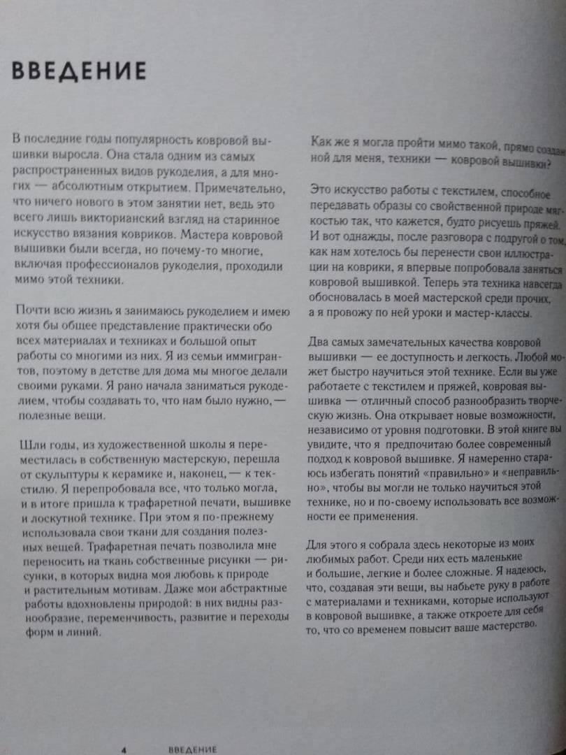 ОписаниеКовровая вышивка - древнее искусство, родом из Персии. И это название отнюдь не означает, что с ее помощью можно создавать только ковры. Просто технология очень похожа на ту, которую использовали ковроделы во все времена и во всех странах. Популярность современной ковровой вышивки легко объясняется простотой техники и рисунка и одновременно удивительной красотой предметов быта, аксессуаов или декора, которые она позволяет создать. И для этого не нужны особые навыки и умения, достаточно вкуса и немного времени, иглы или специального крючка и небольшого количества ниток. Красивая вещь получится абсолютно у всех.Канадский мастер и педагог Арунна Куннораж научит вас создавать стильные и красивые предметы и разрабатывать собственные дизайны, сочетать цвета и строить композицию, посвятит в тонкости и секреты мастерства, котрые сделают ваши работы по-настоящему уникальными и неповторимыми. Ковровая вышивка снова в моде. Дерзайте!Красочная и стильная книга канадского мастера и преподавателя прикладного искусства Арунны Куннораж наполнена подробными инструкциями и мастер-классами по