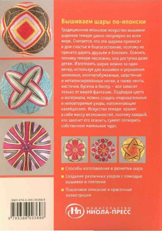 ОписаниеПознакомитесь со старинным японским искусством изготовления праздничных украшений в виде самодельных шариков, вышитых разноцветными нитками. Такими яркими шариками разных размеров можно великолепно и оригинально оформить любое помещение - будь то детская комната, гостиная или прихожая. Они привнесут в любой дом праздничную атмосферу, уют и восточный колорит.Познакомитесь со старинным японским искусством изготовления праздничных украшений в виде самодельных шариков, вышитых разноцветными нитками. Такими яркими шариками разных размеров можно великолепно и оригинально оформить любое помещение - будь то детская комната, гостиная или прихожая. Они привнесут в любой дом праздничную атмосферу, уют и восточный колорит.