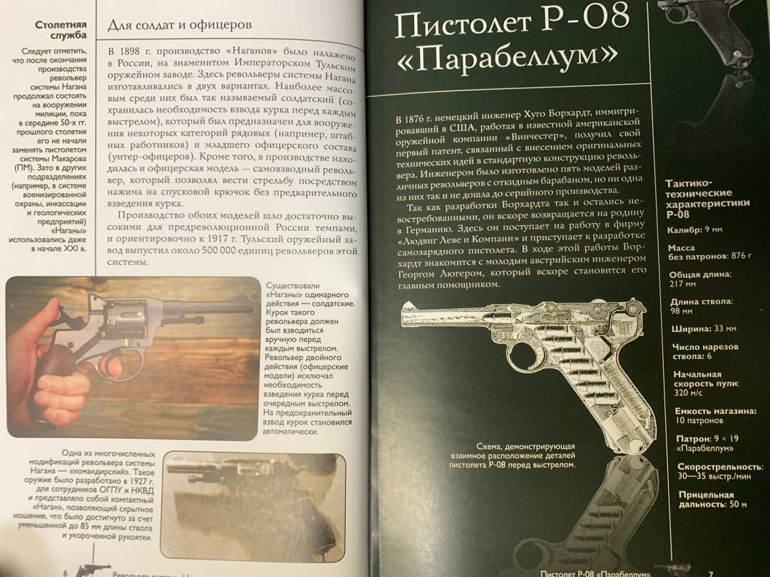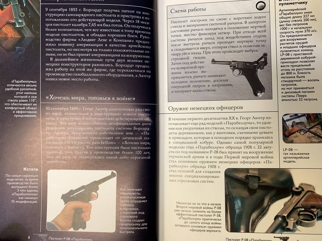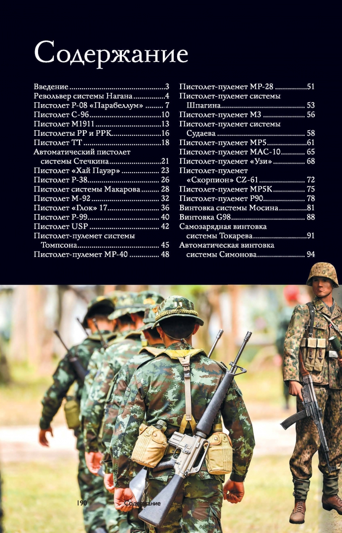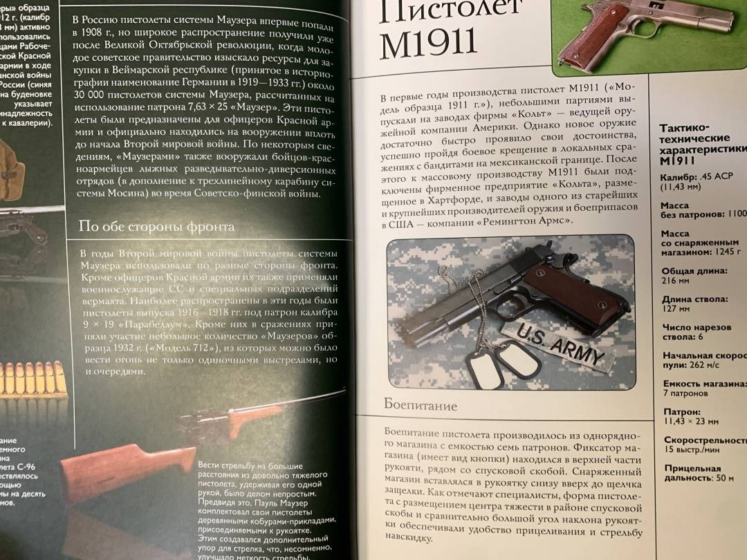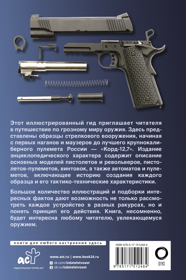 ОписаниеЭтот иллюстрированный гид приглашает читателя в путешествие по грозному миру оружия. Здесь представлены образцы стрелкового вооружения, начиная с первых наганов и маузеров до лучшего крупнокалиберного пулемета России — «Корд-12,7». Издание энциклопедического характера содержит описание основных моделей пистолетов и револьверов, пистолетов-пулеметов, винтовок, а также автоматов и пулеметов, включающее историю создания каждого образца и его тактико-технические характеристики. Большое количество иллюстраций и подборки интересных фактов дают возможность не только рассмотреть каждое устройство в разных ракурсах, но и понять принцип его действия. Книга, несомненно, будет интересна любому читателю, увлекающемуся оружием.Этот иллюстрированный гид приглашает читателя в путешествие по грозному миру оружия. Здесь представлены образцы стрелкового вооружения, начиная с первых наганов и маузеров до лучшего крупнокалиберного пулемета России — «Корд-12,7». Издание энциклопедического характера содержит описание основных моделей пистолетов и револьверов, пистолетов-пулеметов, винтовок, а также автоматов и пулеметов, включающее историю создания каждого образца и его тактико-технические характеристики. Большое количество иллюстраций и подборки интересных фактов дают возможность не только рассмотреть каждое устройство в разных ракурсах, но и понять принцип его действия. Книга, несомненно, будет интересна любому читателю, увлекающемуся оружием.