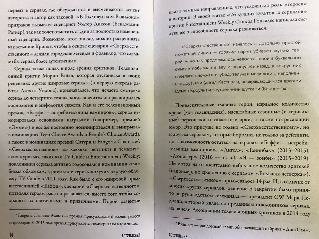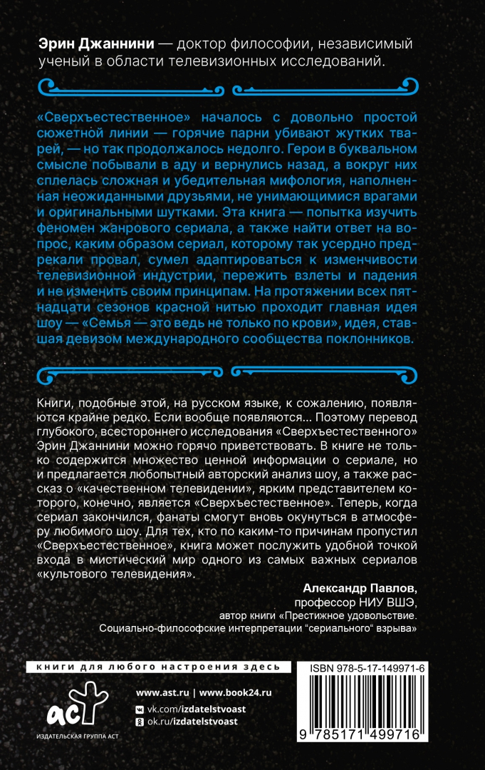 СвернутьЭрин Джаннини – доктор философии, независимый ученый в области телевизионных исследований.О книге «Сверхъестественное: история невероятного путешествия»:Это попытка изучить феномен жанрового сериала, а также найти ответ на вопрос, каким образом сериал, которому так усердно предрекали провал, сумел адаптироваться к изменчивости телевизионной индустрии, пережить взлеты и падения и не изменить своим принципам. «Сверхъестественное» началось с довольно простой сюжетной линии — горячие парни убивают жутких тварей, — но так продолжалось недолго. Герои в буквальном смысле побывали в аду и вернулись назад, а вокруг них сплелась сложная и убедительная мифология, наполненная неожиданными друзьями, не унимающимися врагами и оригинальными шутками. На протяжении всех пятнадцати сезонов красной нитью проходит главная идея шоу – «семья – это ведь не только по крови», идея, ставшая девизом международного сообщества поклонников.Из книги «Сверхъестественное: история невероятного путешествия» вы узнаете:• Историю создания сериала;• В чем секрет успеха истории о братьях Винчестер на телевидении;• Какие мифы, фольклор и сериалы прошлого столетия стали вдохновением для создателей «Сверхъестественного».Для кого эта книга:• Для поклонников сериала;• Для любителей кино и студентов.«Сверхъестественное: история невероятного путешествия» – путеводитель по миру одного из самых популярных сериалов в истории телевидения. Вместе с Эрин Джаннини вы узнаете: