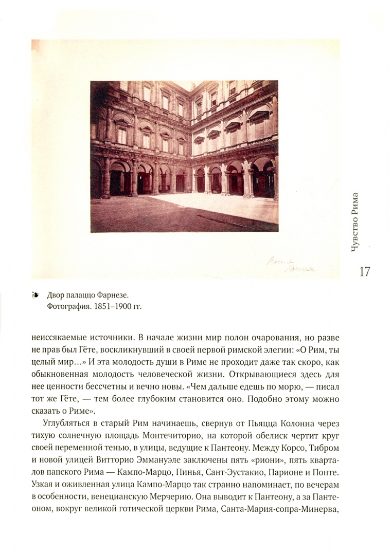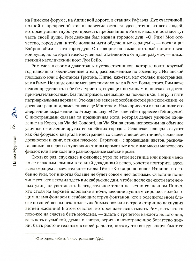 ОписаниеПавел Павлович Муратов (1881-1950) - искусствовед, писатель, истинный человек культуры Серебряного века. В прошлом хранитель в отделе изящных искусств и классических древностей Румянцевского музея, Павел Муратов умел видеть историческую перспективу и увлекательно рассказывать о культурных явлениях.Перед читателем одна из самых известных книг об Италии. Посетив в 1908 г. землю Данте, Леонардо да Винчи и Микеланджело, Павел Муратов навсегда влюбился в ее красоту и написал книгу, в которой сумел объединить памятники, картины и достопримечательности в единые художественные образы итальянских городов.Читателю предстоит постичь особое чувство Рима, проследив развитие Вечного города со времен Античности до барокко. Полюбоваться пейзажами римской Кампаньи, увидеть своеобразие городов Лациума. Оказаться в шумном Неаполе с его страстью к наживе и развлечениям и, наконец, причалить к Сицилии.Иллюстративный ряд издания включает в себя фоторепродукции гравюр Пиранези, а также полотна знаменитых французских почитателей Италии: Клода Лоррена и Никола Пуссена. Особого внимания заслуживают редкие кадры конца XIX - начала XX века, запечатлевшие настоящий итальянский колорит: на них неаполитанцы сушат то белье, то спагетти, то танцуют.СвернутьПавел Павлович Муратов (1881-1950) - искусствовед, писатель, истинный человек культуры Серебряного века. В прошлом хранитель в отделе изящных искусств и классических древностей Румянцевского музея, Павел Муратов умел видеть историческую перспективу и увлекательно рассказывать о культурных явлениях.Перед читателем одна из самых известных книг об Италии. Посетив в 1908 г. землю Данте, Леонардо да Винчи и Микеланджело, Павел Муратов навсегда влюбился в ее красоту и написал книгу, в которой сумел объединить памятники, картины и достопримечательности в единые художественные образы итальянских городов.Читателю предстоит постичь особое чувство Рима, проследив развитие Вечного города со времен Античности до барокко. Полюбоваться пейзажами римской Кампаньи, увидеть своеобразие городов Лациума. Оказаться в шумном Неаполе с его страстью к наживе и развлечениям и, наконец, причалить к Сицилии.Иллюстративный ряд издания включает в себя фоторепродукции гравюр Пиранези, а также полотна знаменитых французских почитателей Италии: Клода Лоррена и Никола Пуссена. Особого внимания заслуживают редкие кадры конца XIX - начала XX века, запечатлевшие настоящий итальянский колорит: на них неаполитанцы сушат то белье, то спагетти, то танцуют.СвернутьСвернуть