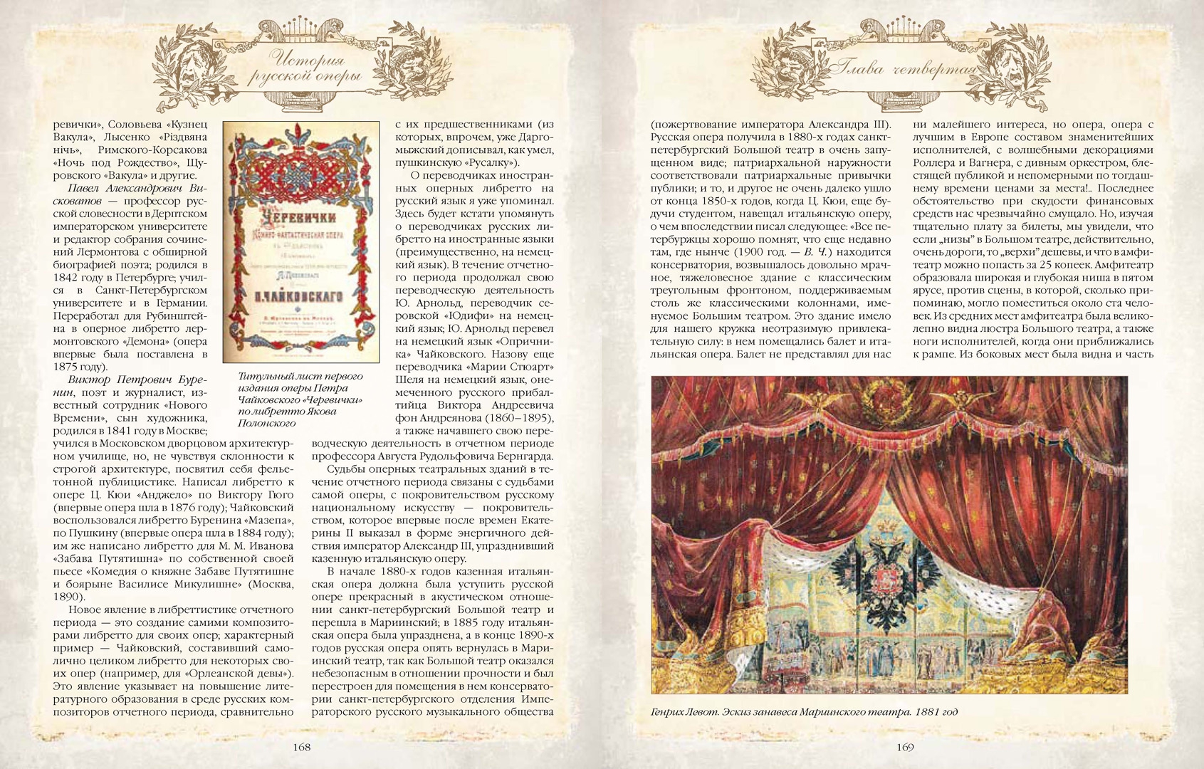 ОписаниеВпервые за столетие к читателям возвращается уникальная книга об истории русского театра! Увидев свет в 1903 году, эта книга стала первой и на многие годы - единственной книгой по истории русской оперы. Сегодня ее ранние издания являются библиографической редкостью.Работа выдающегося русского музыковеда Всеволода Чешихина расскажет вам об огромном пути, пройденном русским оперным искусством с 1674 года до начала XX столетия. О "золотом веке" русской оперы, символом которого стало творчество Федора Шаляпина, о других звездах отечественной музыкальной сцены, знаменитых театрах и постановках легендарных опер, великих оперных композиторах - Чайковском, Бородине, Кюи, Римском-Корсакове, Даргомыжском и многих других.Настоящее издание основано на расширенной версии 1905 года и дополнено огромным числом уникальных иллюстраций, в том числе - сценами из первых постановок знаменитых творений русских композиторов.Впервые за столетие к читателям возвращается уникальная книга об истории русского театра! Увидев свет в 1903 году, эта книга стала первой и на многие годы - единственной книгой по истории русской оперы. Сегодня ее ранние издания являются библиографической редкостью.Работа выдающегося русского музыковеда Всеволода Чешихина расскажет вам об огромном пути, пройденном русским оперным искусством с 1674 года до начала XX столетия. О "золотом веке" русской оперы, символом которого стало творчество Федора Шаляпина, о других звездах отечественной музыкальной сцены, знаменитых театрах и постановках легендарных опер, великих оперных композиторах - Чайковском, Бородине, Кюи, Римском-Корсакове, Даргомыжском и многих других.Настоящее издание основано на расширенной версии 1905 года и дополнено огромным числом уникальных иллюстраций, в том числе - сценами из первых постановок знаменитых творений русских композиторов.