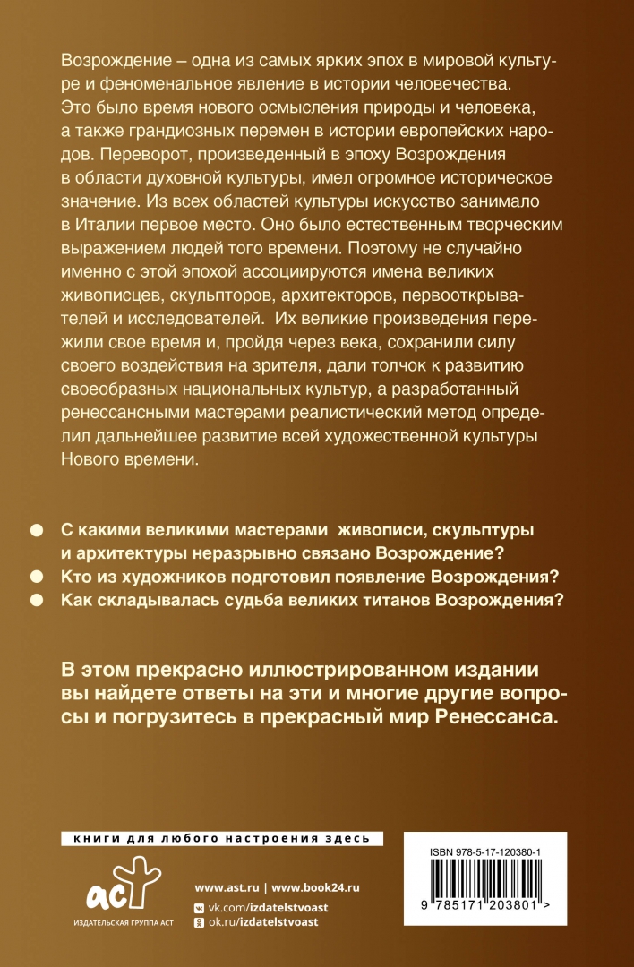 В этом прекрасно иллюстрированном издании вы найдете ответы на эти, и многие другие вопросы и погрузитесь в прекрасный мир Ренессанса.СвернутьВозрождение – одна из самых ярких эпох в мировой культуре и феноменальное явление в истории человечества. Это было время нового осмысления природы и человека, а также грандиозных перемен в истории европейских народов. Переворот, произведенный в эпоху Возрождения в области духовной культуры, имел огромное историческое значение. Из всех областей культуры изобразительное искусство занимало в Италии первое место. Оно было естественным творческим выражением людей того времени. Поэтому не случайно именно с этой эпохой ассоциируются имена великих живописцев, скульпторов, архитекторов, первооткрывателей и исследователей. Их великие произведения пережили свое время и, пройдя через века, сохранили силу своего воздействия на зрителя, дали толчок к развитию своеобразных национальных культур, а разработанный ренессансными мастерами реалистический метод определил дальнейшее развитие всей художественной культуры Нового времени.