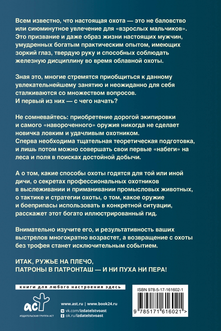 ОписаниеВ наши дни охота уже утратила свое первоначальное предназначение, и сегодня это, скорее, спорт. Но, согласитесь, немногие виды спорта отличаются такой увлекательностью, таким драйвом и мощным выбросом адреналина, как охота на птицу или зверя в естественных природных условиях. Эта книга подробно и интересно расскажет вам о различных способах добычи промысловых животных и птиц, обитающих в самых разных уголках бывшего Советского Союза. И начинающие охотники, и профессионалы почерпнут на ее страницах много нового для себя, ведь здесь описываются размеры, вес и окрас потенциальной добычи, излюбленные места ее обитания и особенности поведения, приводятся способы выслеживания и приманивания дичи, правила поведения на охоте и многое другое. Где и когда лучше устроить засаду, как правильно подобрать ружье и патроны, установить самоловы и капканы, что нужно знать, чтобы охотиться на манок, с собакой, с подъезда, по чернотропу, из шалаша, с чучелами, на засидках, - постигнув эти охотничьи премудрости, вы никогда не вернетесь с охоты без ценного трофея.СвернутьВ наши дни охота уже утратила свое первоначальное предназначение, и сегодня это, скорее, спорт. Но, согласитесь, немногие виды спорта отличаются такой увлекательностью, таким драйвом и мощным выбросом адреналина, как охота на птицу или зверя в естественных природных условиях. Эта книга подробно и интересно расскажет вам о различных способах добычи промысловых животных и птиц, обитающих в самых разных уголках бывшего Советского Союза. И начинающие охотники, и профессионалы почерпнут на ее страницах много нового для себя, ведь здесь описываются размеры, вес и окрас потенциальной добычи, излюбленные места ее обитания и особенности поведения, приводятся способы выслеживания и приманивания дичи, правила поведения на охоте и многое другое. Где и когда лучше устроить засаду, как правильно подобрать ружье и патроны, установить самоловы и капканы, что нужно знать, чтобы охотиться на манок, с собакой, с подъезда, по чернотропу, из шалаша, с чучелами, на засидках, - постигнув эти охотничьи премудрости, вы никогда не вернетесь с охоты без ценного трофея.СвернутьСвернуть